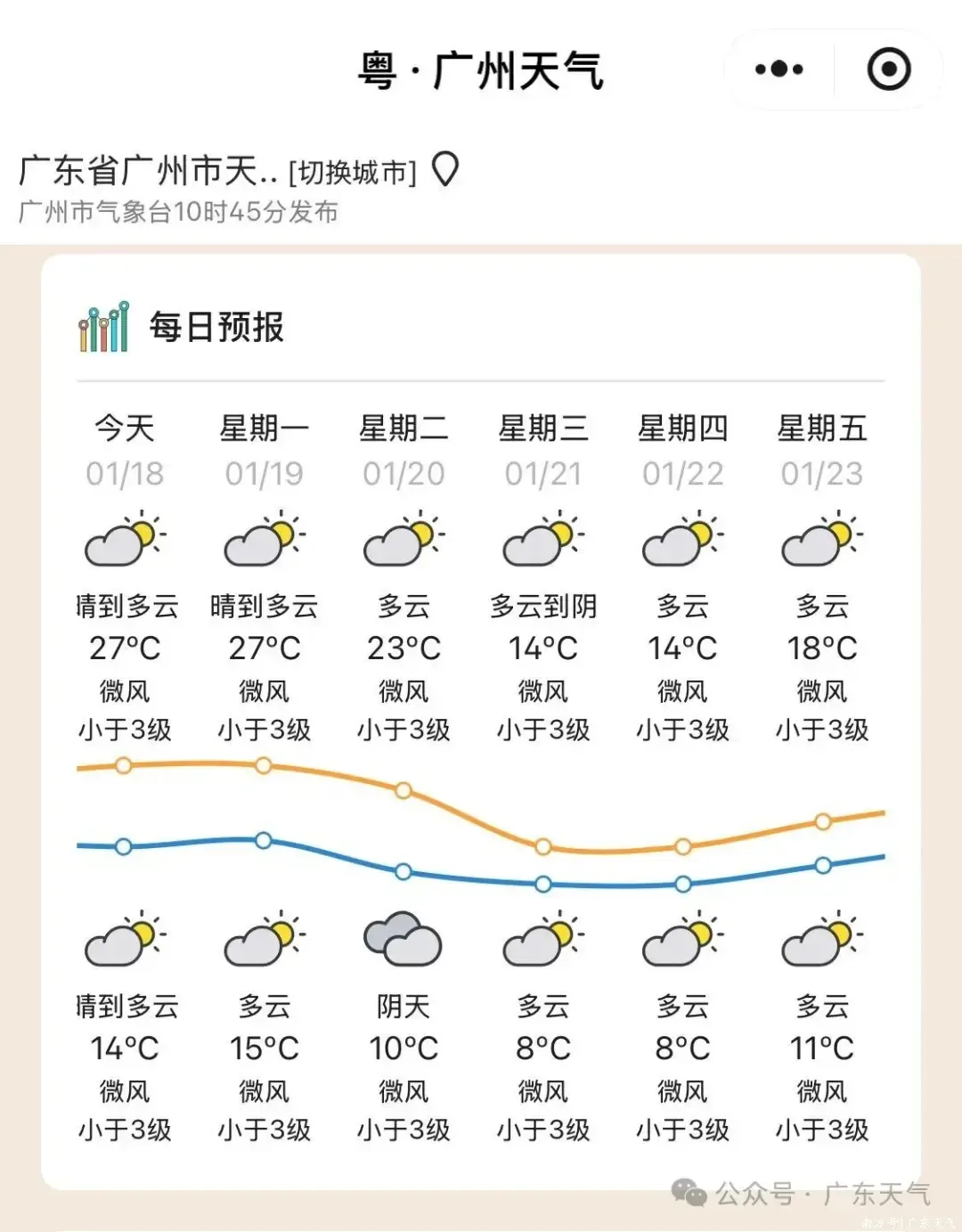 由于广东近期气温较高,下周冷空气将带来“换季式”降温,冷暖大反转,各位要注意防寒保暖,尤其是婴幼儿、老年人以及慢性基础病患者。