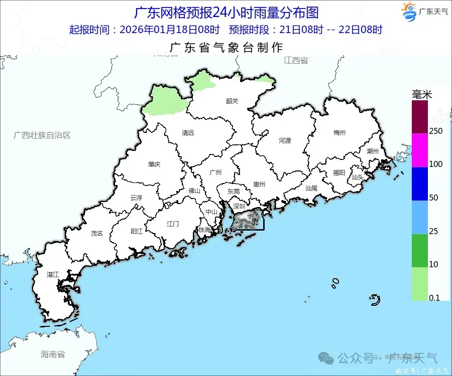 21-22日,韶关、清远北部阴天,有分散小雨,高海拔山区有雨夹雪或冻雨,其余市县多云,局部有零星小雨。