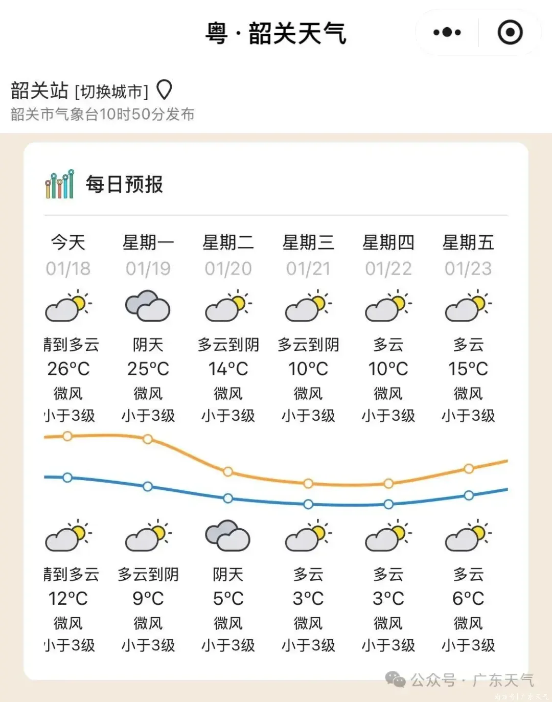 20日,韶关北部、清远北部市县7~10℃,南部沿海市县16~19℃,其余市县12~15℃。
