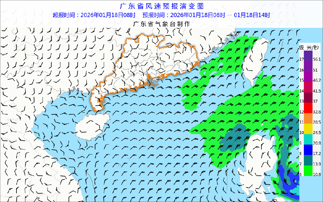 海上大风预报:18-19日,粤东海面东北风6级阵风7级,台湾海峡、巴士海峡、南海东北部海面东北风6-7级阵风8级。20-21日,粤东海面东北风7级阵风8级,粤中和粤西海面东北到东风5-6级阵风7级,台湾海峡、巴士海峡、南海东北部海面东北风7-8级阵风9级,请注意海上交通和作业安全。