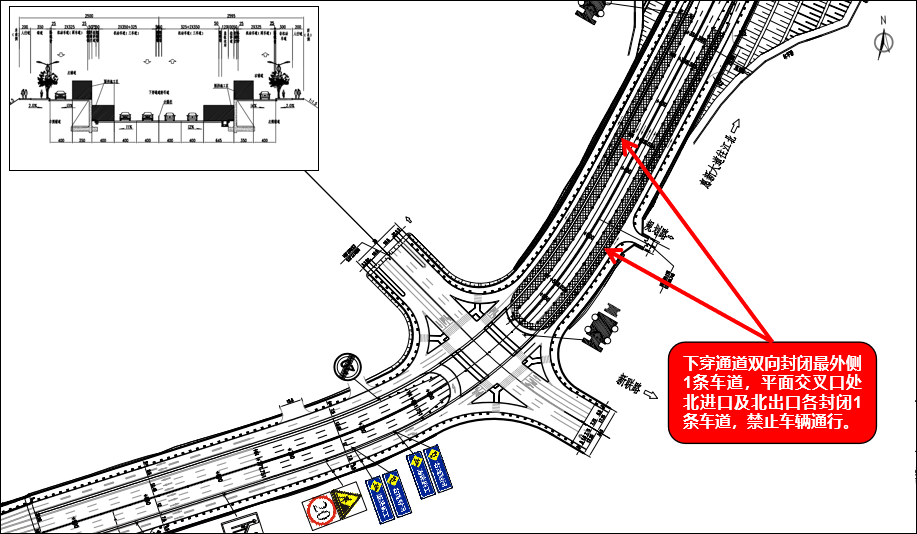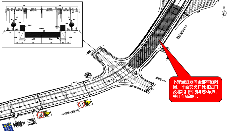 2026年5月25日至施工结束(共约1个月),惠新大道/新联路节点下穿通道双向全部车道封闭,平面交叉口处北进口及北出口各封闭1条车道,禁止车辆通行。