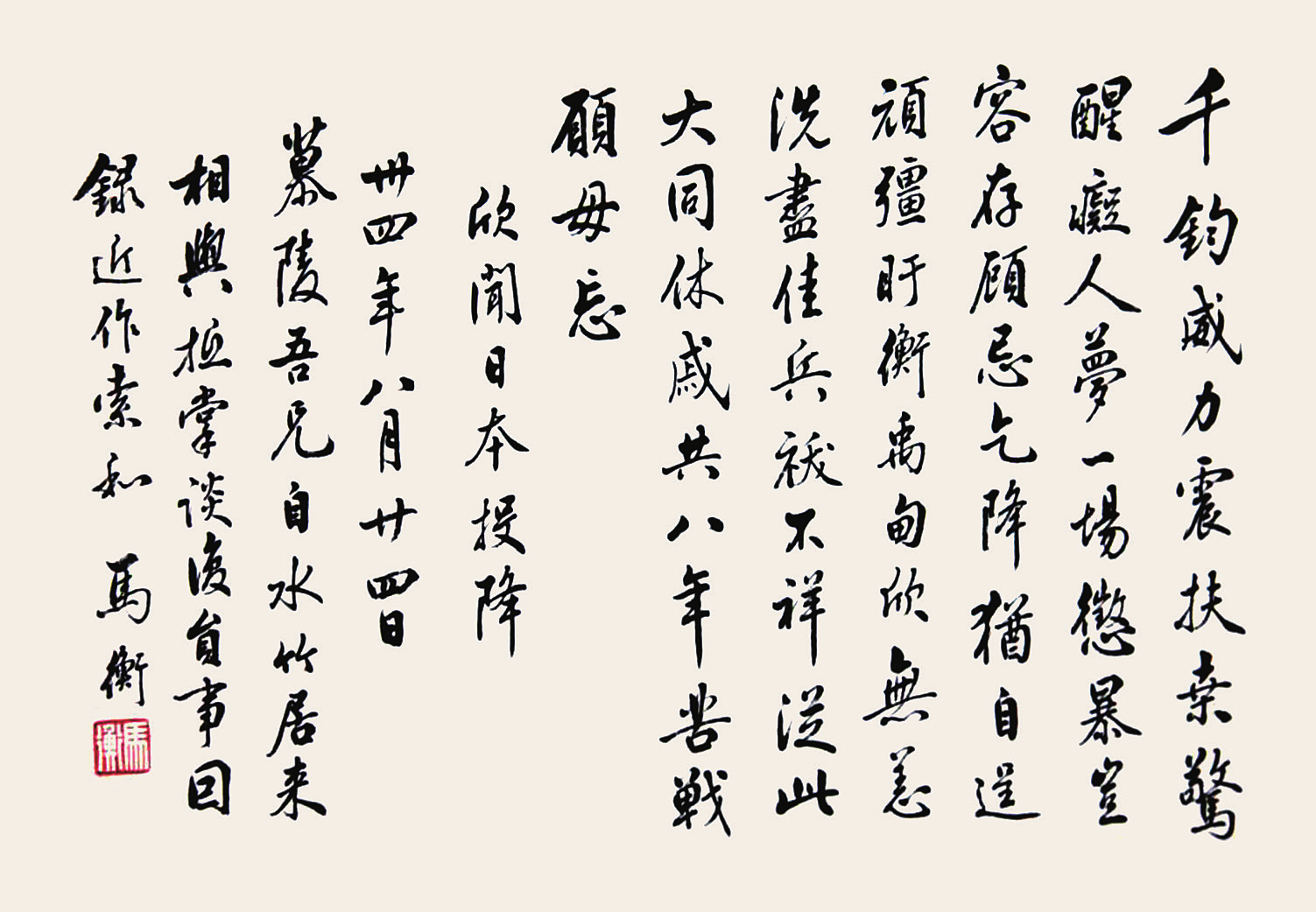 譬如,马衡在1938年至1945年间写下了87首诗歌,都与抗战有关,与文物存藏有关。第一首为《答方鹤老》:“劫余文物在人间,客里豪情已渐删。强寇即今成弩末,征人何日唱刀环。关河累我风尘老,诗酒输君岁月闲。多感殷勤珍护意,举杯相嘱看岷山。”1945年8月24日,他写下《欣闻日本投降》:“千钧威力震扶桑,惊醒痴人梦一场。惩暴岂容存顾忌,乞降犹自逞顽强。盱衡禹甸欣无恙,洗尽佳兵祓不祥。从此大同休戚共,八年苦战愿毋忘。”两相对照,令人感慨不已。