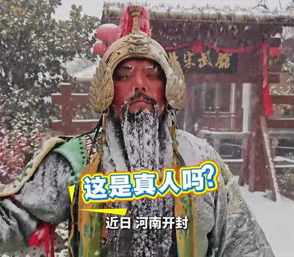 近日,河南多地天气接近0℃,不少地方已经下雪,一游客在开封万岁山武侠城游玩时,发现雪地里一座关羽的“冰雕”,走近才发现是一位正在表演站岗的NPC演员,看到身上都是雪、胡子上都是冰,双手也裸露在外拿着大刀,不禁让人感叹“太敬业了”。