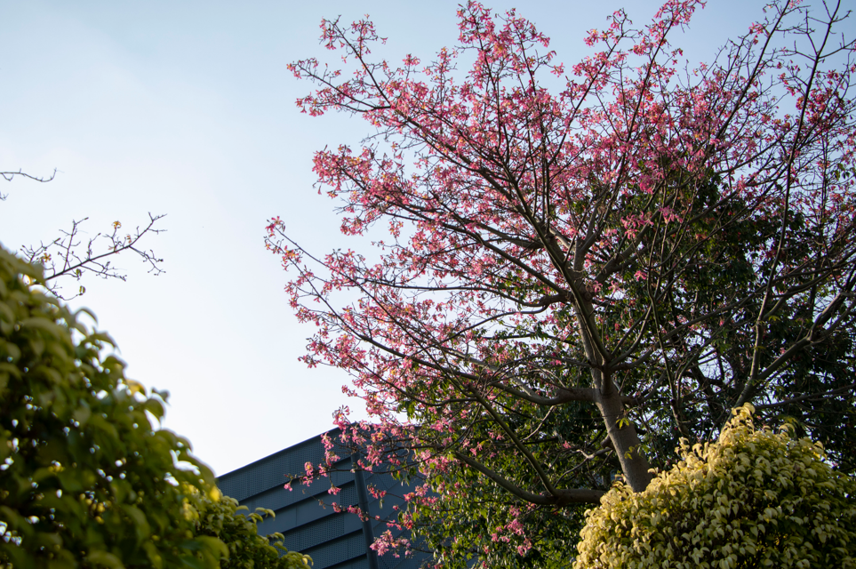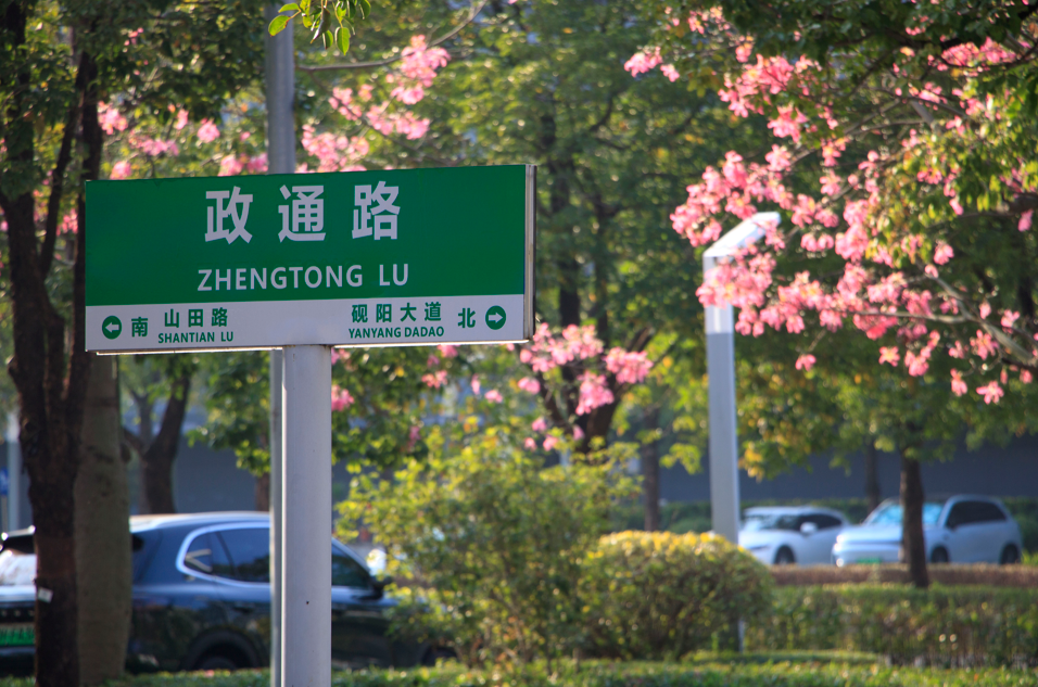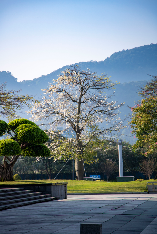 除了满眼的粉色,在粤港澳大湾区西部商务中心前,还藏着白色异木棉。