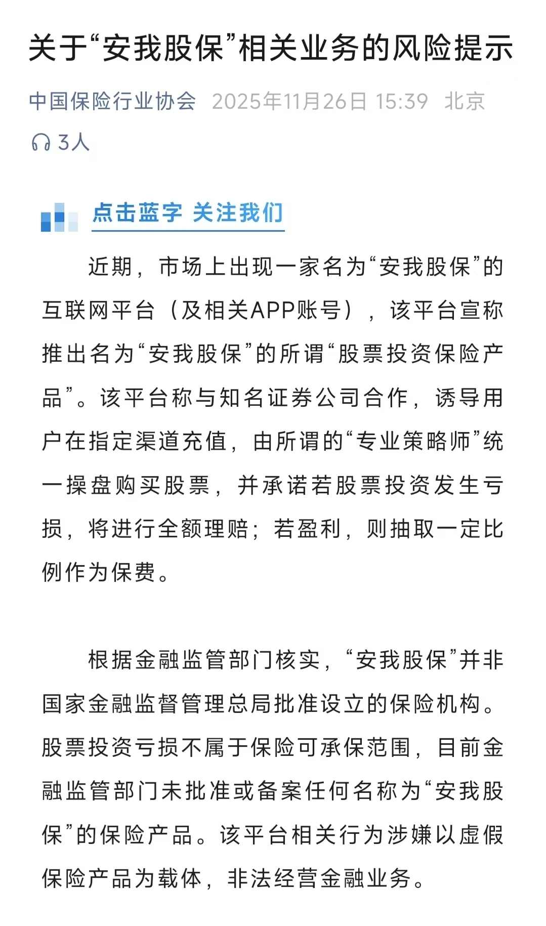 对此,中国保险行业协会(以下简称“中保协”)于11月26日紧急发布《关于“安我股保”相关业务的风险提示》,揭穿其“假保险、真骗局”的面目,提醒广大投资者警惕金融骗局,守住自己的“钱袋子”。