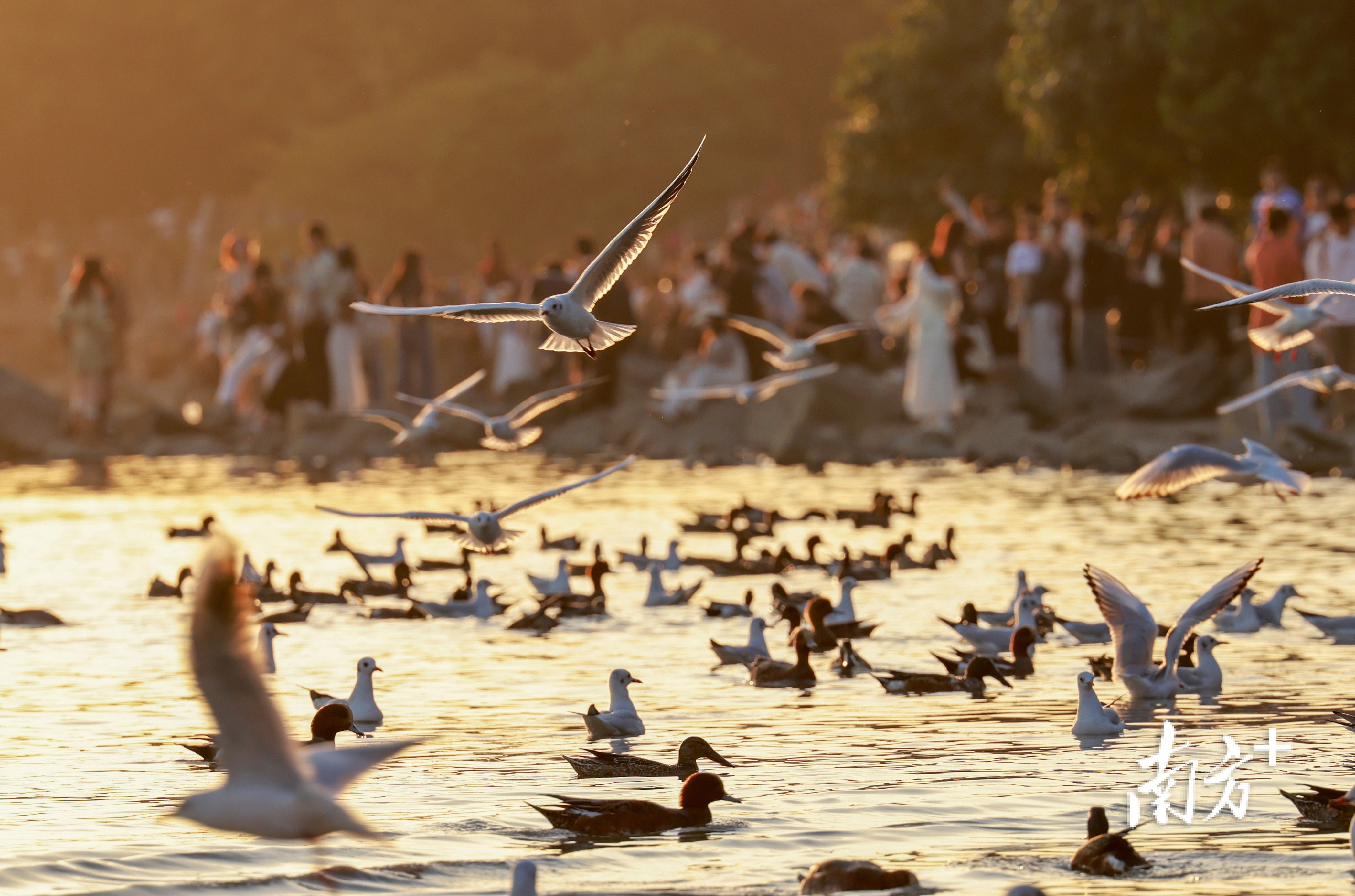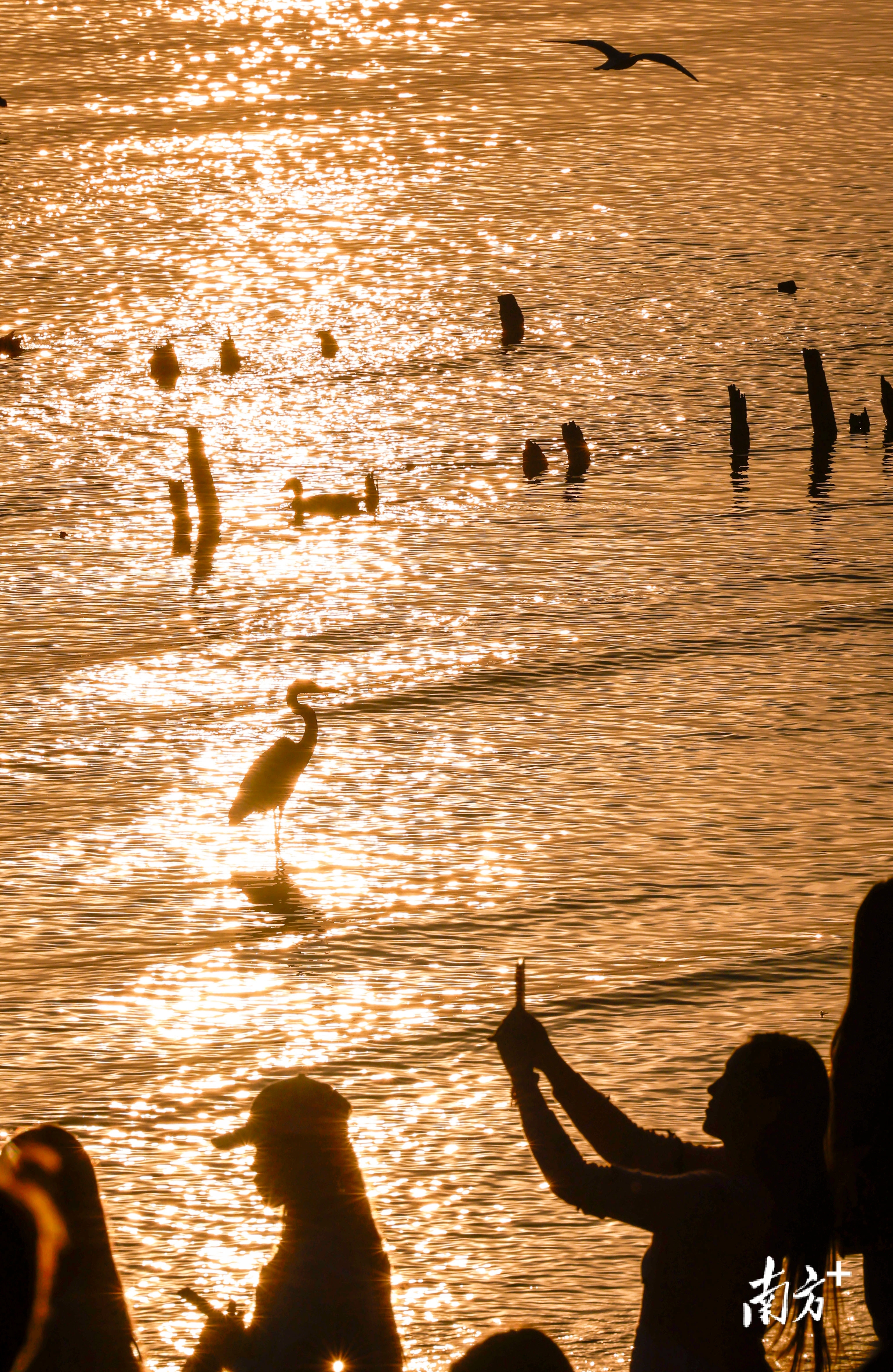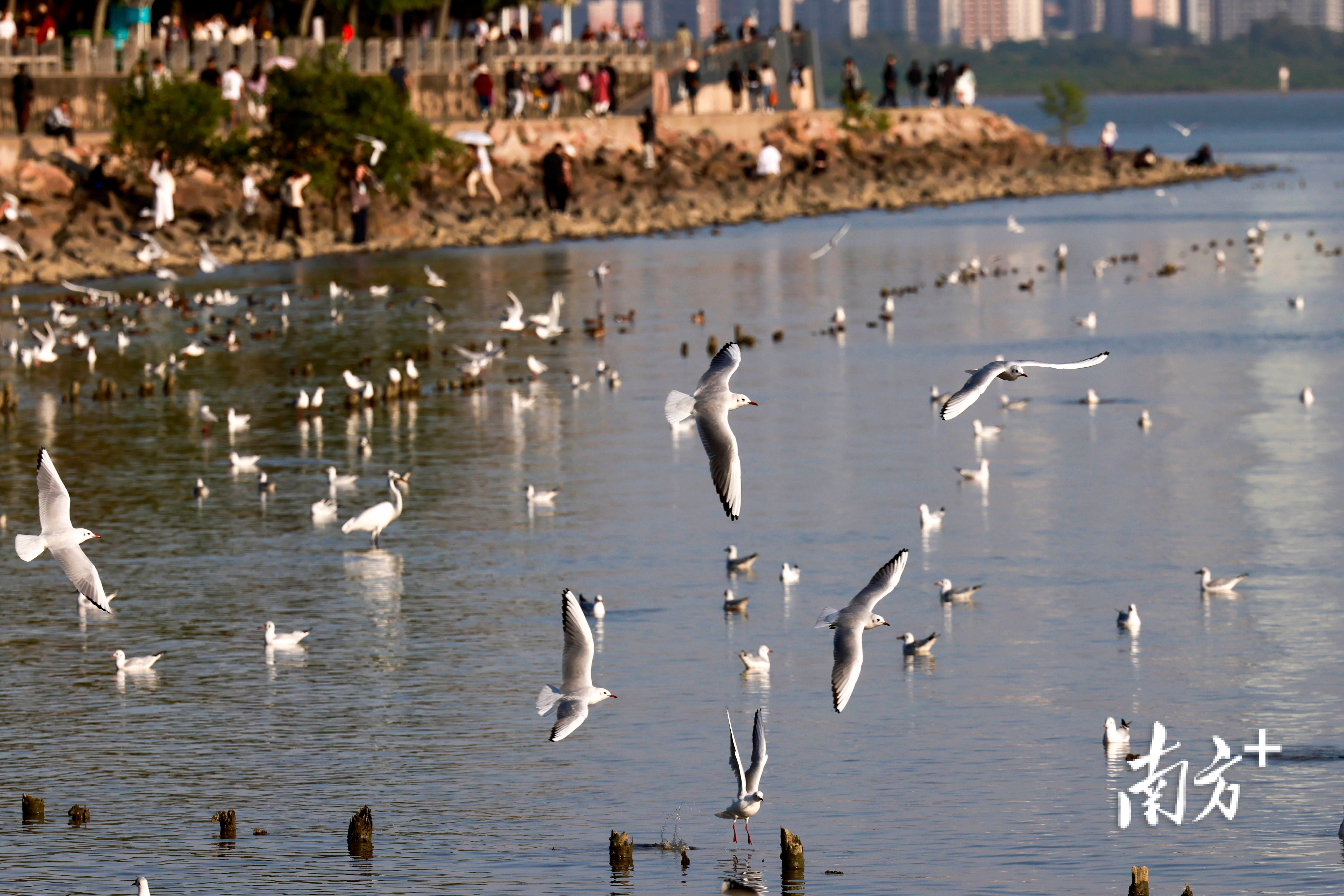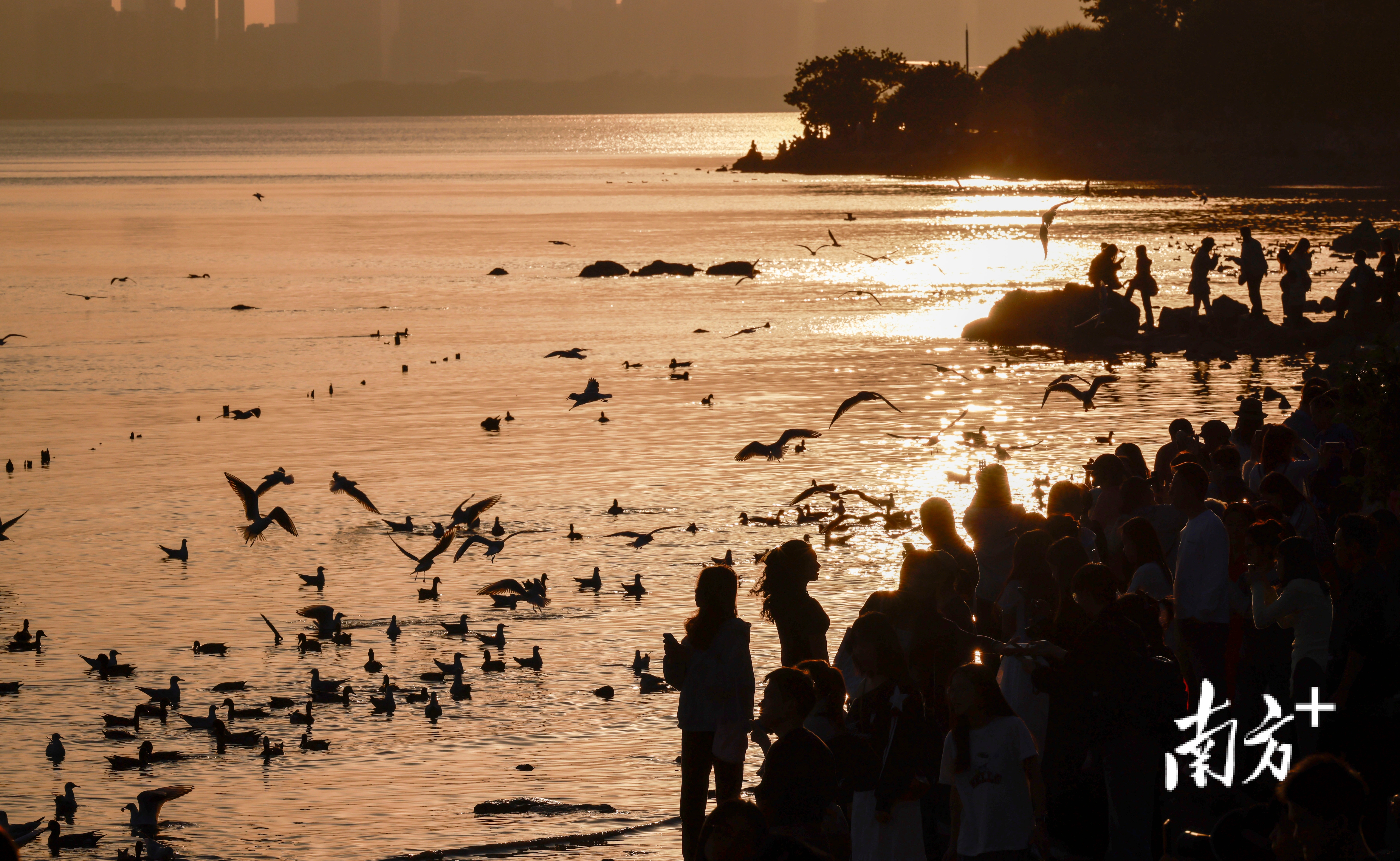 近段时间,不少市民前往深圳湾公园、红树林海滨栈道等地“打卡”,举起手机相机等“长枪短炮”,捕捉候鸟翩然起落的瞬间。日落时分,余晖为海面镀上暖金,鸬鹚归巢、鸥鸟齐飞,栈道上的人群渐渐散去,只留下候鸟在滩涂安然栖息。
