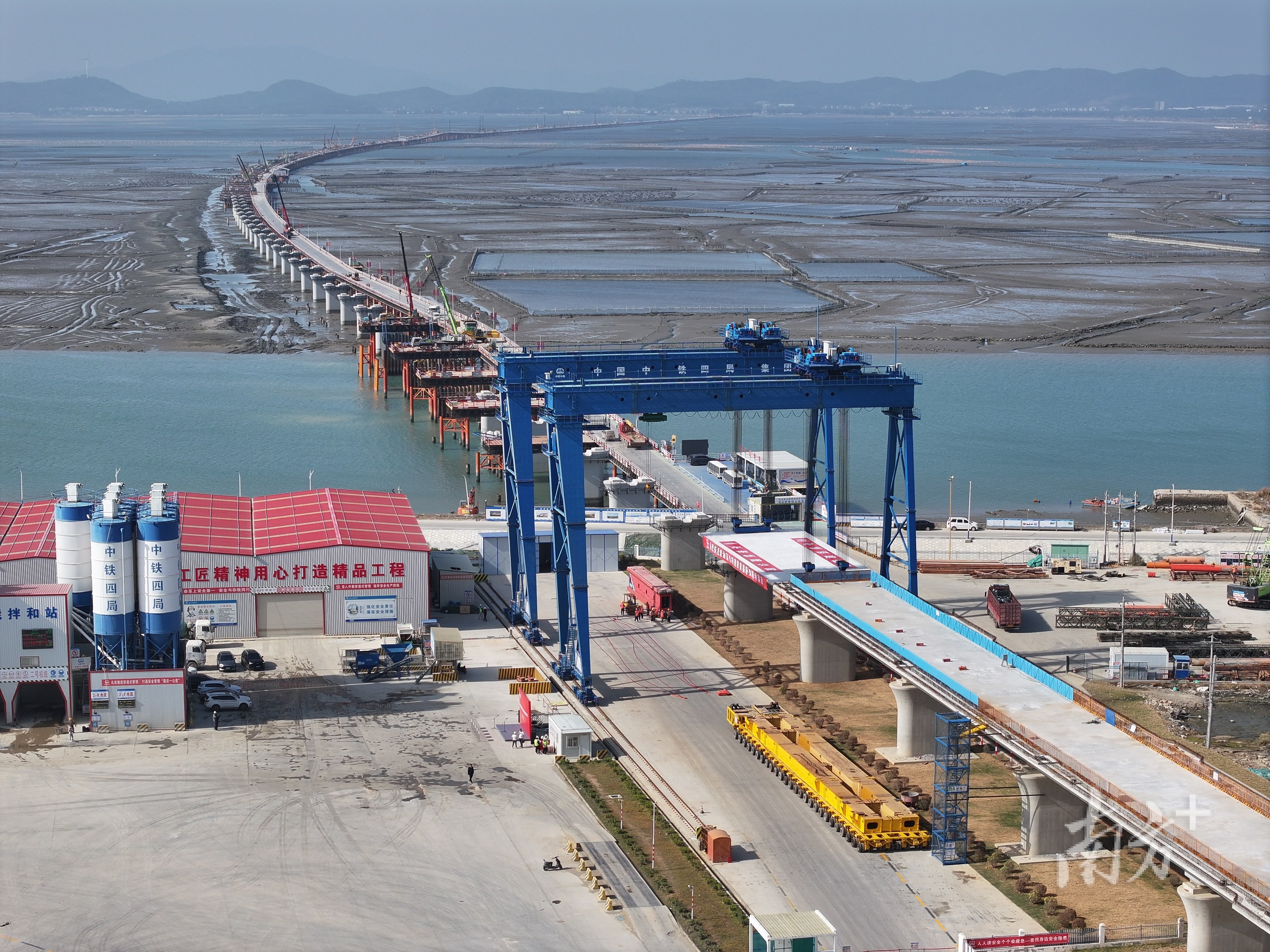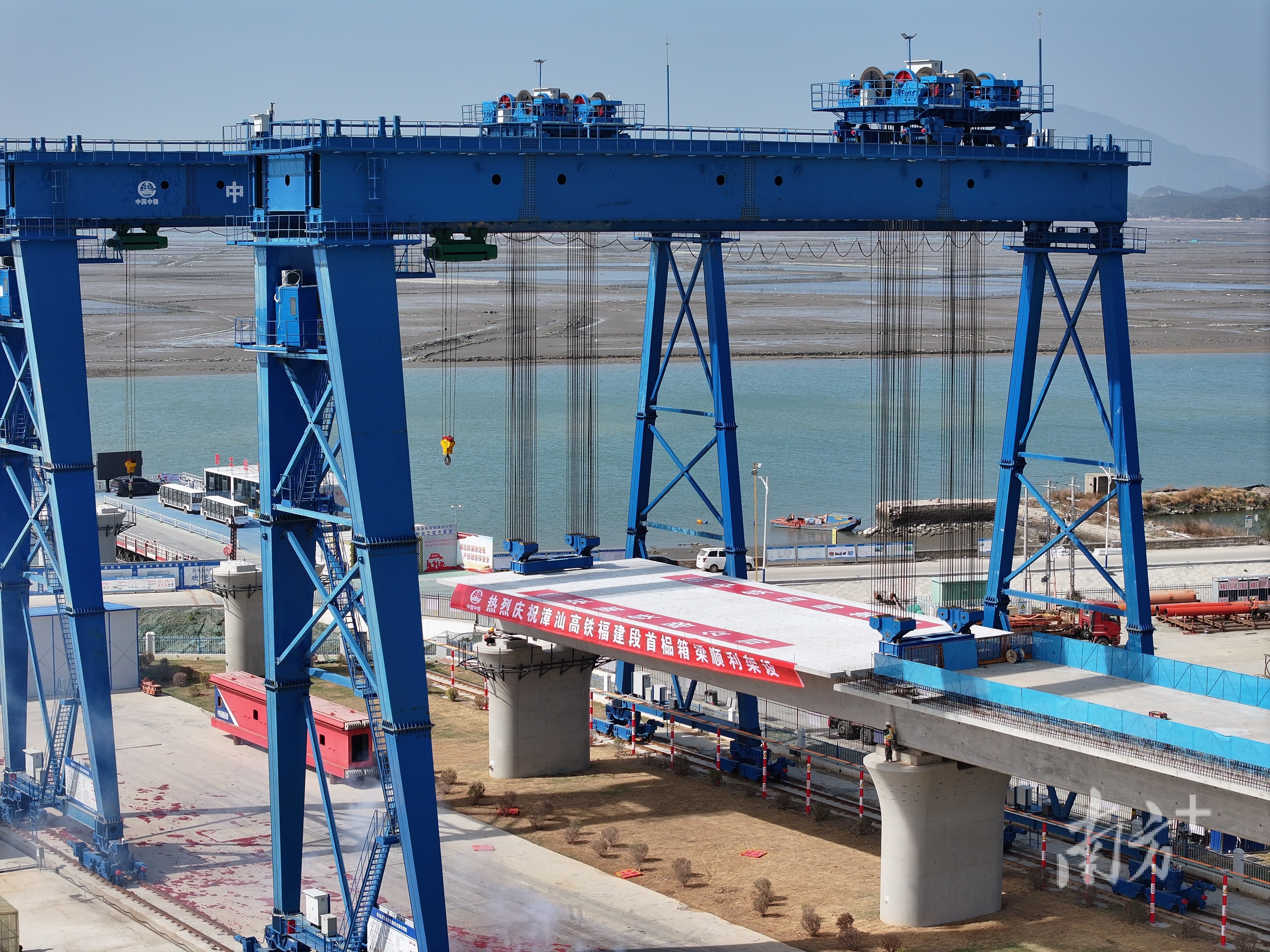 此次完成首榀箱梁架设的东山跨海特大桥全长20.26公里,是漳汕高铁全线最长的跨海桥梁。“大桥跨海域线路长、施工条件复杂。”东南沿海铁路福建有限责任公司漳汕指挥部副指挥长曾清生表示,“我们建立了严格的质量管控体系,组织专家团队开展多轮技术论证,针对地下孤石、滩涂区地质、潮汐落差大等具体难题,制定了专项施工方案,并围绕跨海区域桥梁施工关键技术进行了课题研究攻关。”进入冬季以来,施工团队还针对海域季风强劲的特点,采用信息化管控系统实时监测环境影响,科学安排吊装作业时间,确保架梁施工安全有序推进。