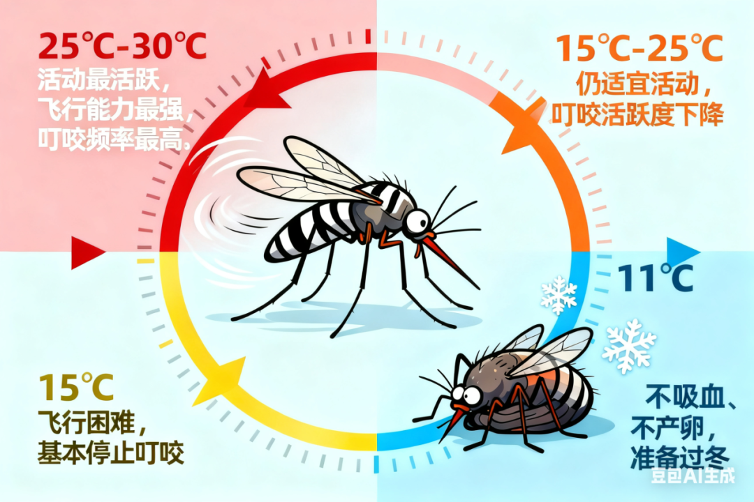 天气转凉并不会立即消灭蚊子,反而会改变它们的行为模式: