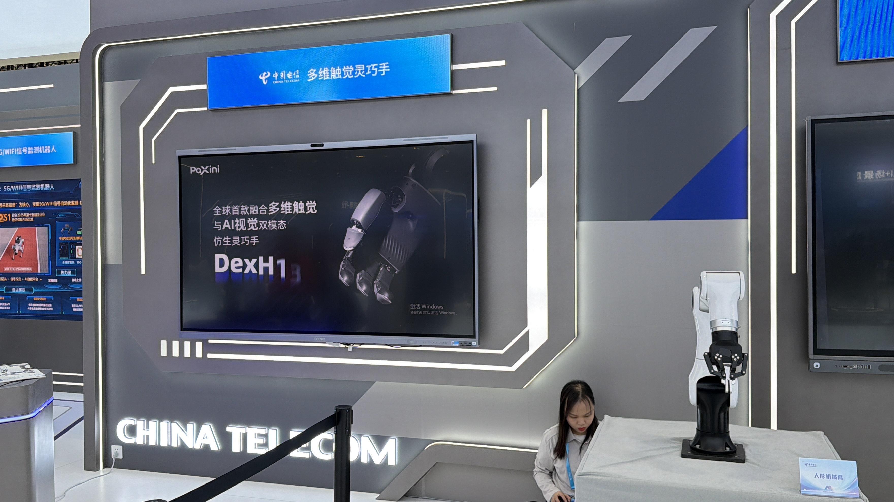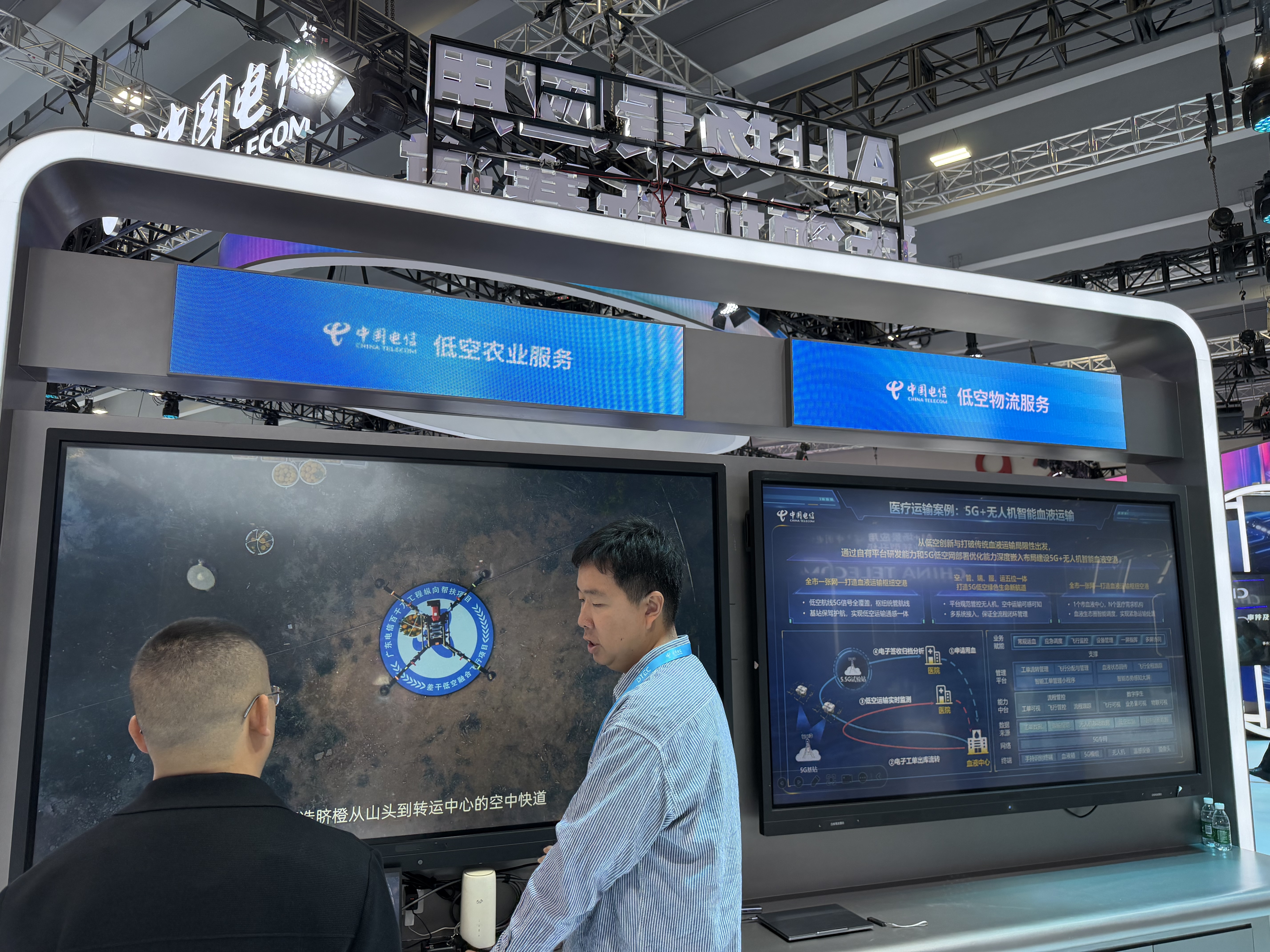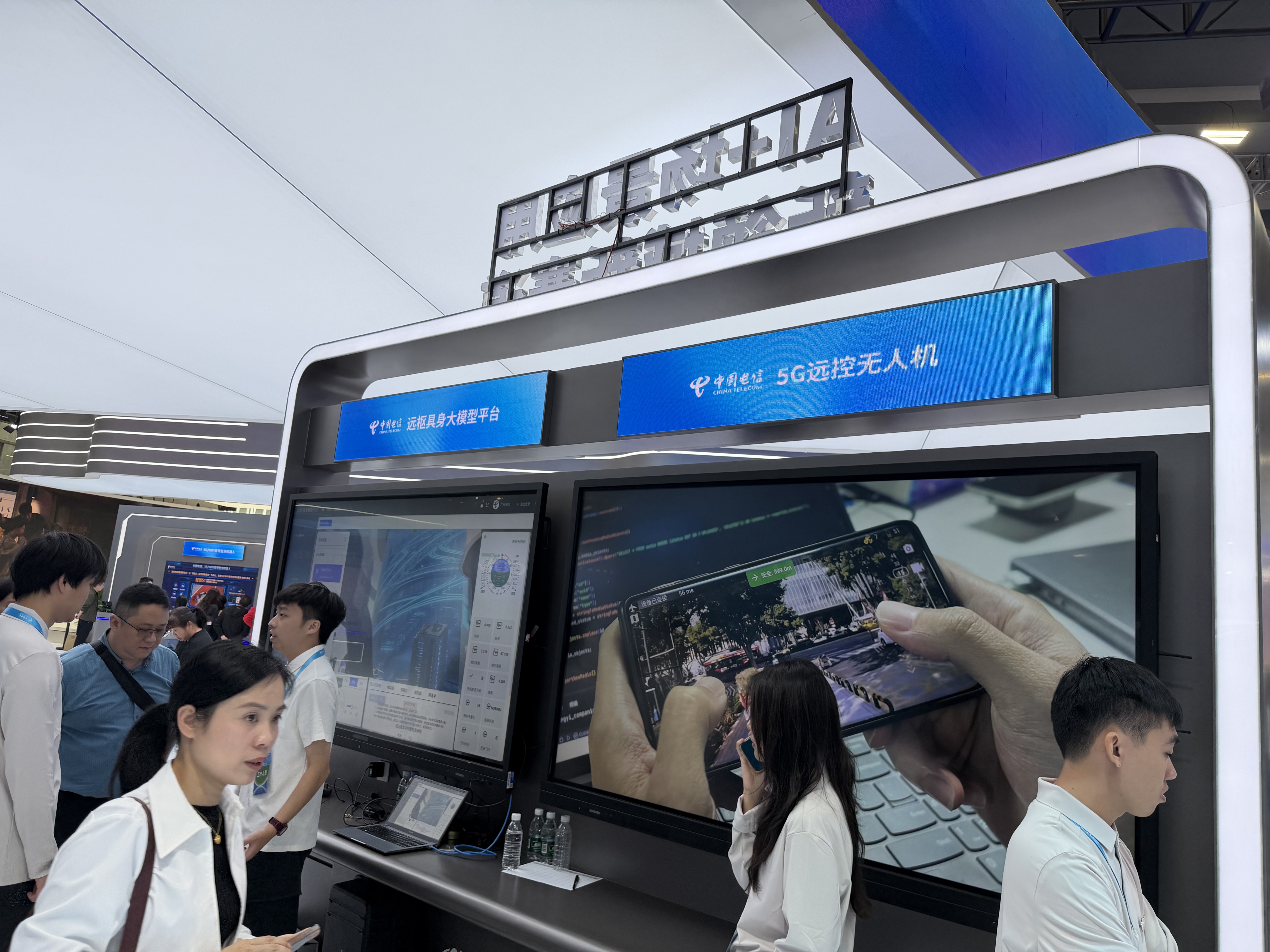 南方+记者注意到,主展区现场透露出中国电信当前瞄准的AI+新领域新赛道具体内容。一是低空相关,包括低空数字化塔台、低空巡检服务、低空农业服务、低空物流服务等,二是机器人,现场展出的机器人包括具身天工机器人、拓斯达具身智能机器人、多维触觉灵巧手、5G/WIFI信号监测机器人,此外,还有远枢具身大模型平台、5G远控无人机。