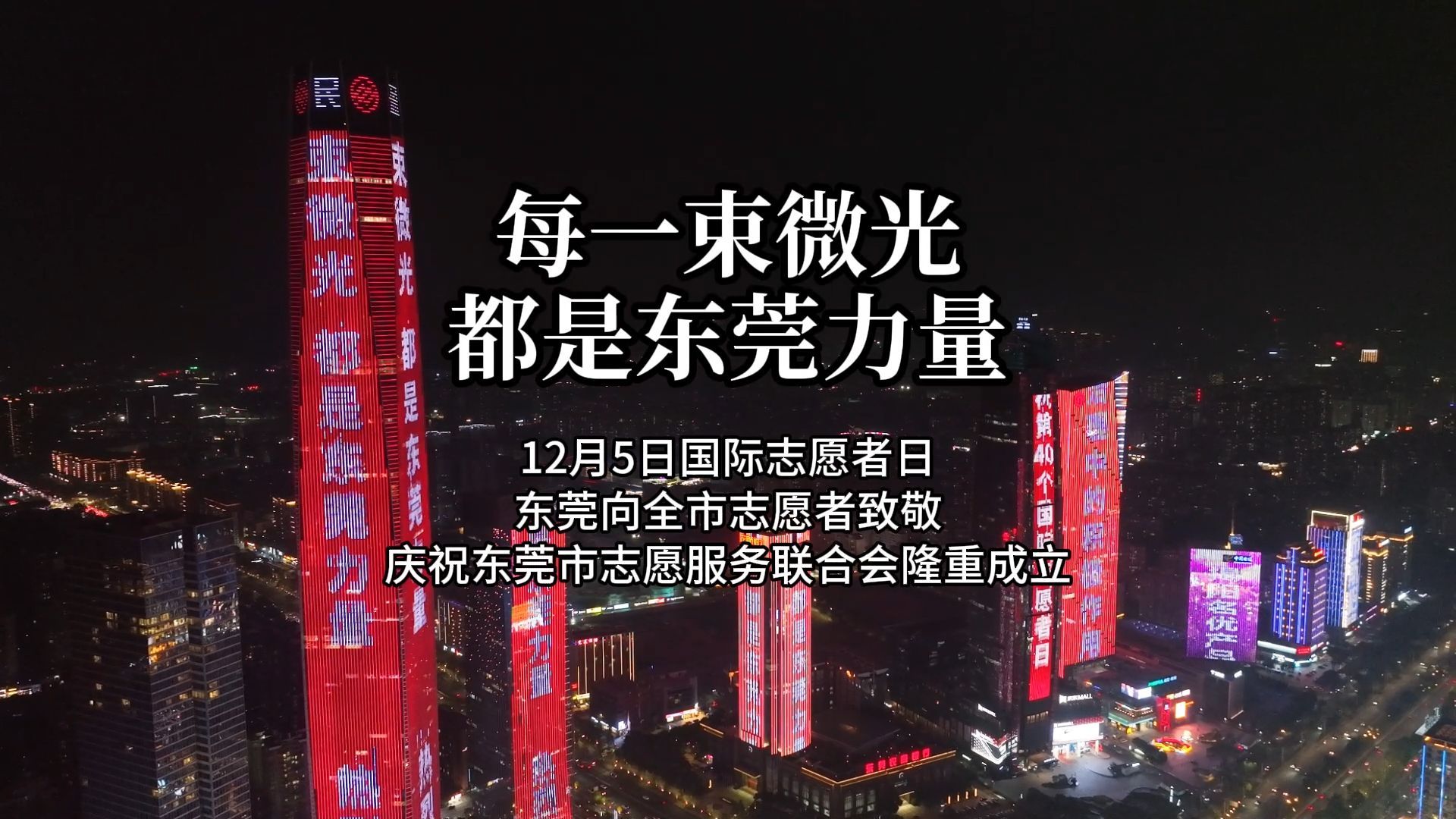 (12月5日,东莞市志愿服务联合会成立大会暨第一次会员大会召开。当晚,东莞地标为国际志愿者日亮灯。)