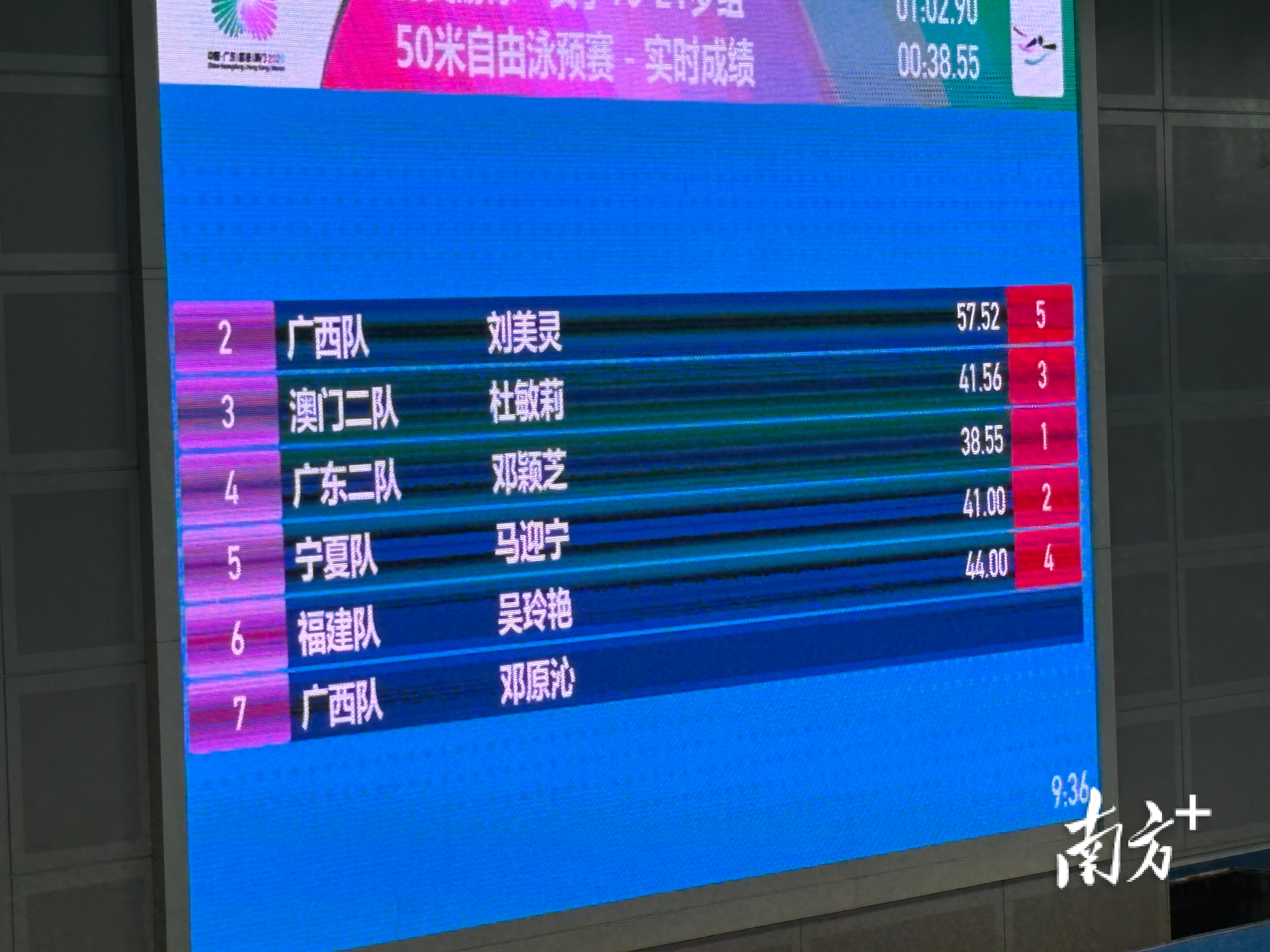在女子16—21岁组50米自由泳预赛中,广东队江门籍运动员邓颖芝以项目最高分脱颖而出,晋级决赛。据广东队领队潘湘俐介绍,邓颖芝曾获省运会冠军,该项目是广东队重点冲金项目。