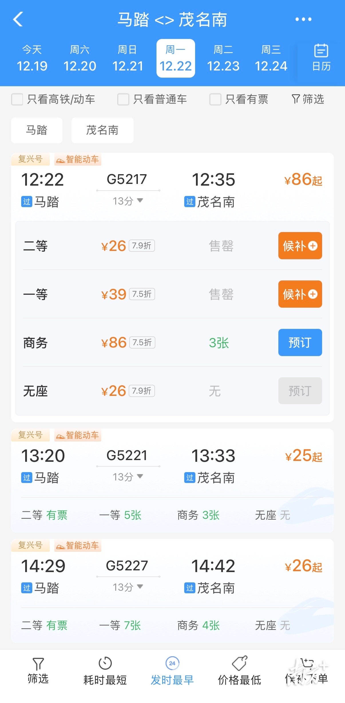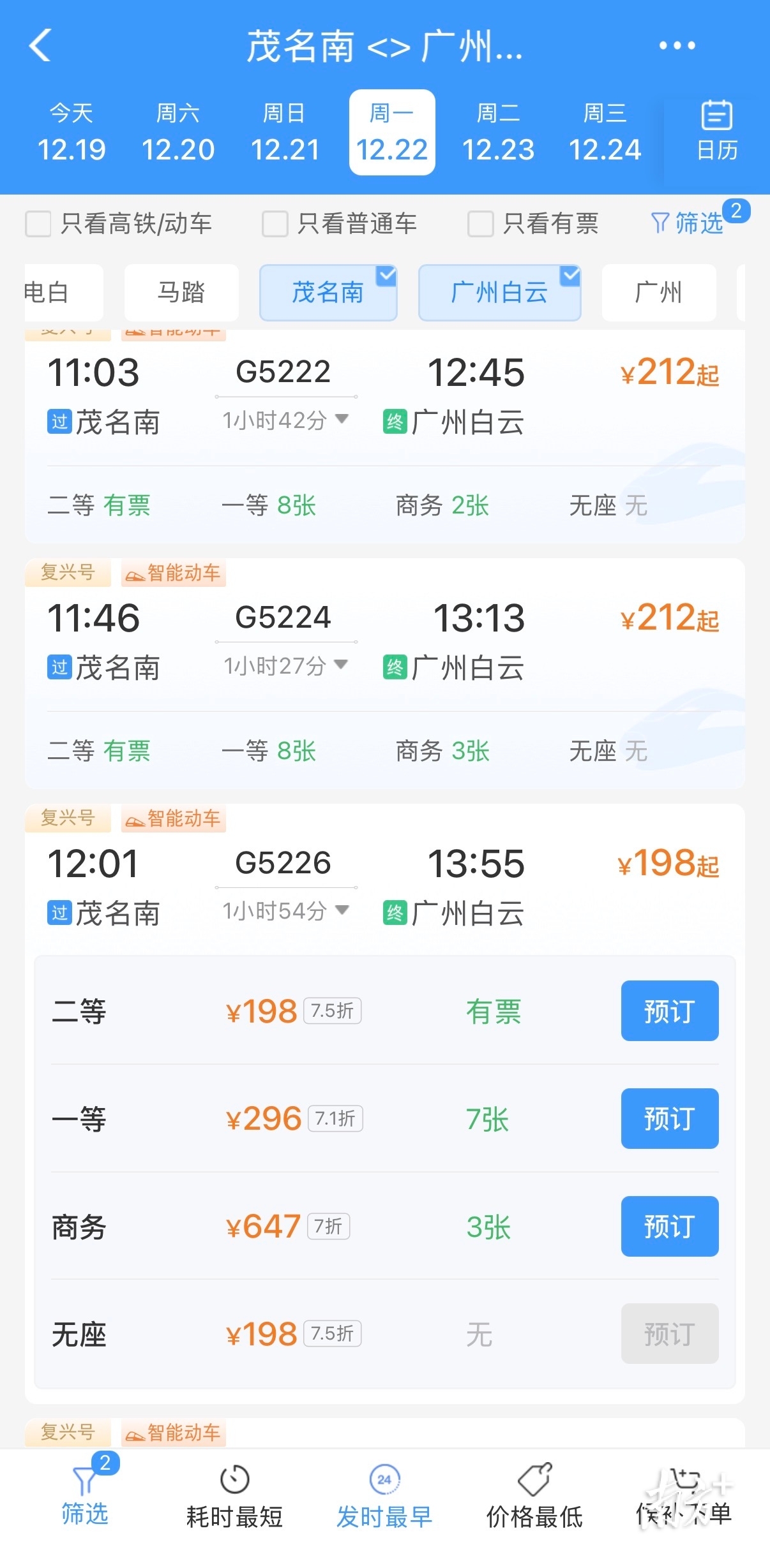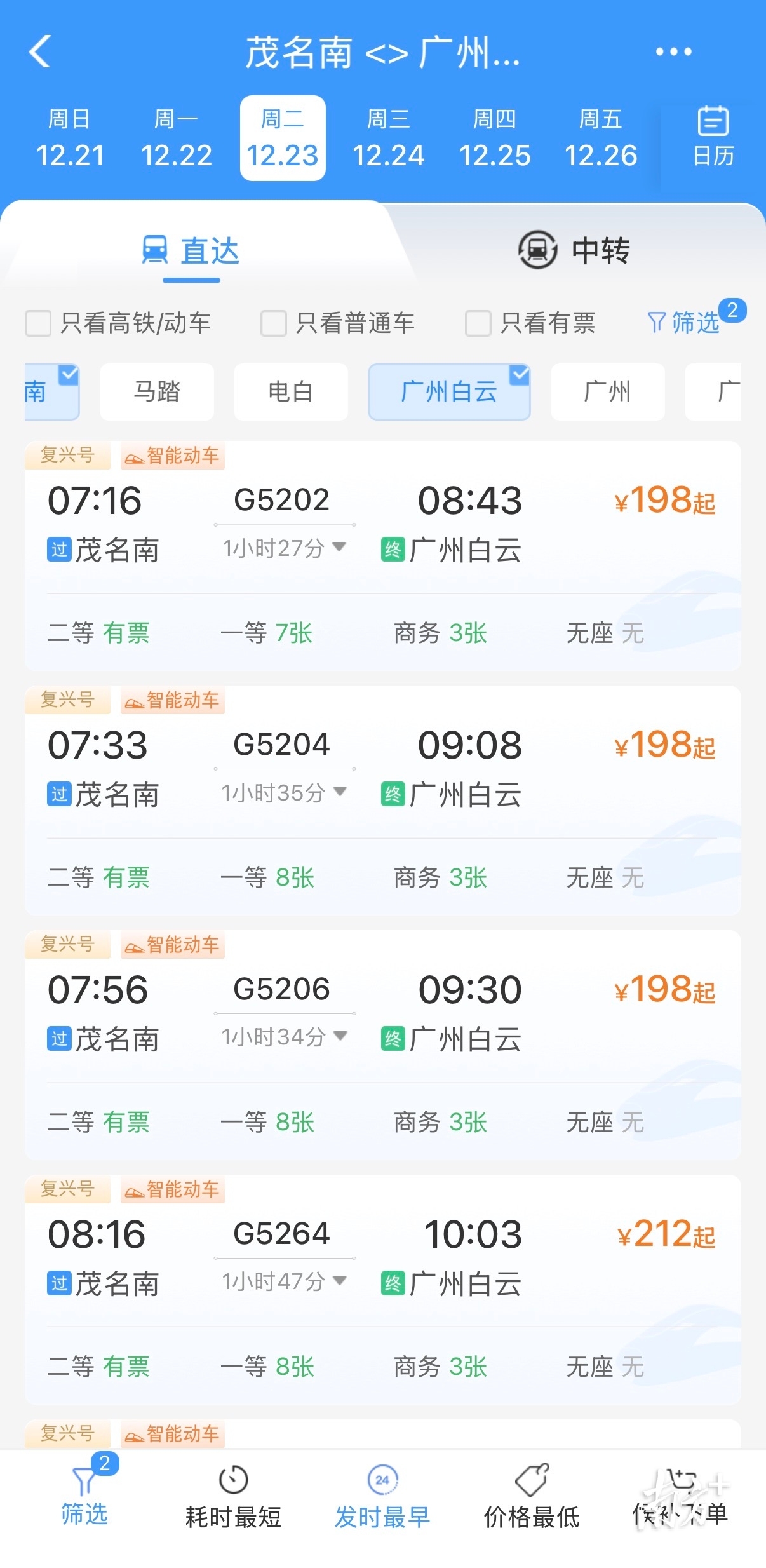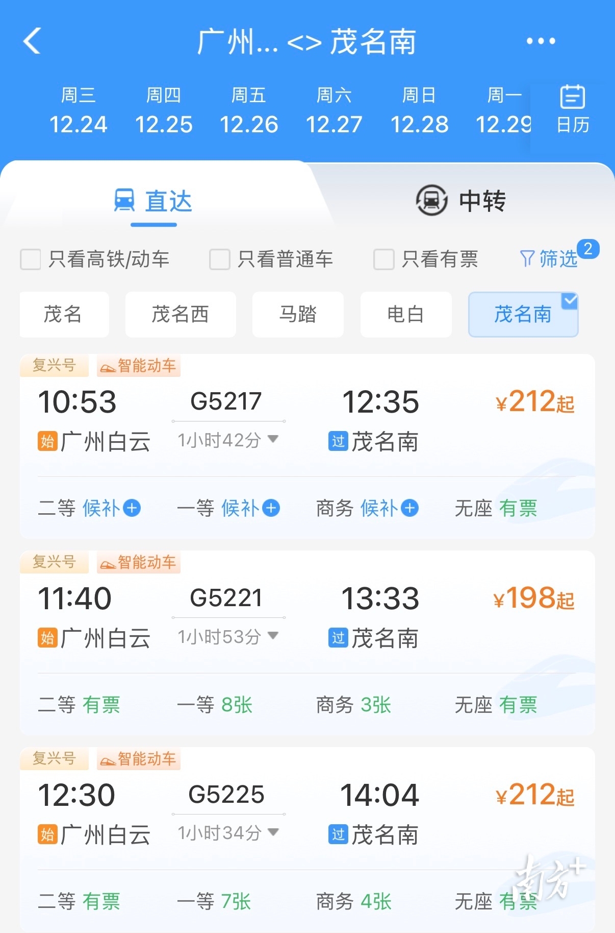 截至发稿时间,广州白云至茂名南站开通首日首趟列车,二等座、一等座、商务座均是候补状态,仅无座有票。