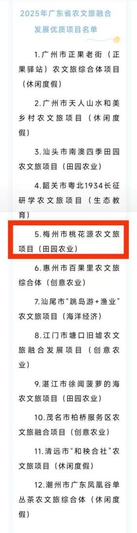 12月15日,经省文旅厅联合省自然资源厅、省农业农村厅在全省首批整县推进农文旅融合发展试点区域开展遴选评审,梅州市桃花源农文旅项目等12个项目脱颖而出,获评2025年广东省农文旅融合发展优质项目。其中,蕉岭桃花源凭借其独特的生态资源、文化底蕴与创新业态,成为梅州市唯一入选的标杆项目,彰显了蕉岭县在农文旅融合领域的示范引领作用。