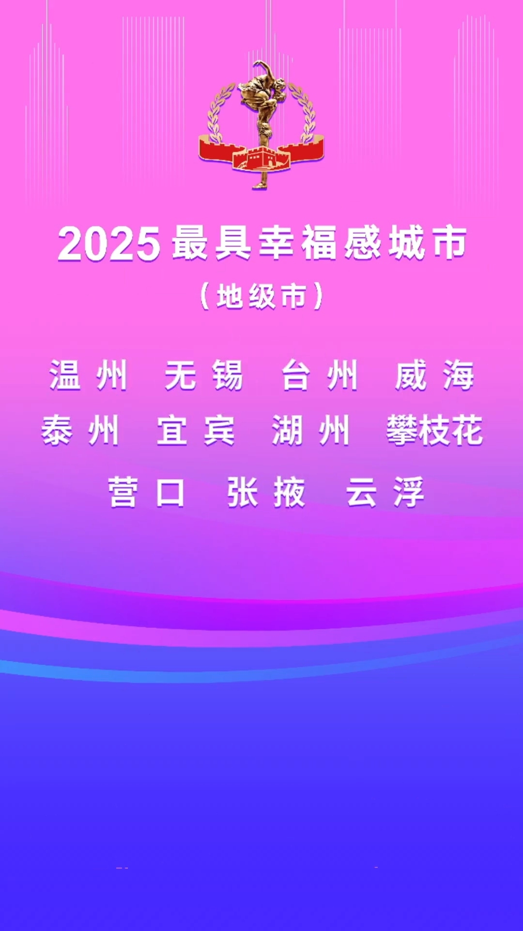 2025“最具幸福感城市”调查推选活动于今年8月启动,通过大数据采集、问卷调查、材料申报、实地调研、专家评审等方式进行,综合往年入选城市榜单,并结合大数据初步筛查结果,确定了“2025最具幸福感城市”候选城市名单,涵盖220个城市及城区。