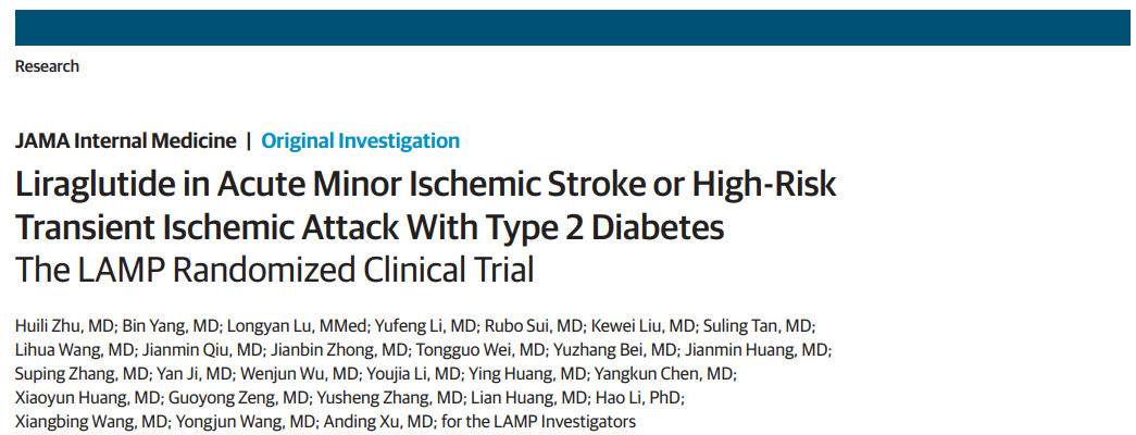 2025年11月4日,暨南大学附属第一医院神经内科徐安定/朱慧丽教授团队以原创性论著形式在JAMA Internal Medicine (双TOP 1区)在线发表题为《Liraglutide in Acute Minor Ischemic Stroke or High-risk Transient Ischemic Attack with Type 2 Diabetes Mellitus: The LAMP Randomized Clinical Trial》的多中心随机对照临床研究结果。该研究首次报道GLP-1RA利拉鲁肽联合标准的卒中二级预防策略可显著减少90天卒中复发,并减少残疾风险,为进一步降低缺血性卒中的残余复发风险及改善功能预后提供了新的研究思路及循证医学证据。