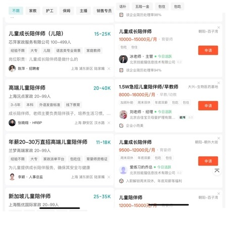 儿童陪伴师不同于传统的保姆或家教,而是集早教、娱乐、生活照料等多功能于一身,旨在为忙碌的家长提供专业化的儿童陪伴服务。在一线城市,儿童陪伴师的薪资水平非常可观,月薪能达到1万至4万元。