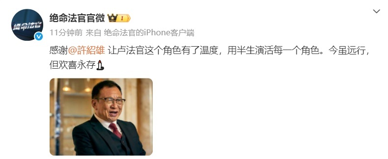 《绝命法官》是许绍雄出演的最后一部作品,他在其中饰演卢维德一角。剧方官微也发文悼念许绍雄,称:“感谢许绍雄让卢法官这个角色有了温度,用半生演活每一个角色。今虽远行,但欢喜永存。”