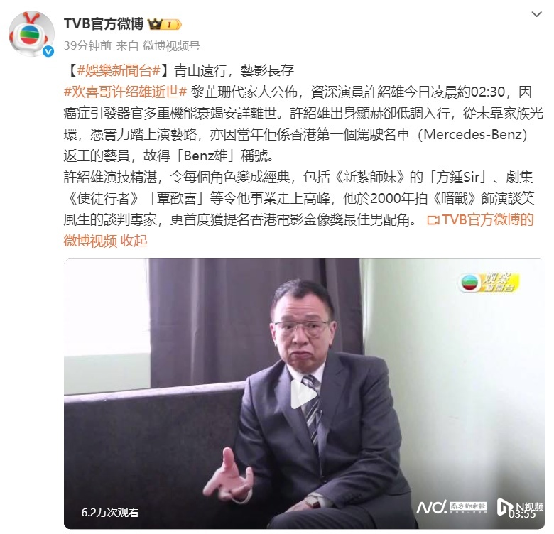 TVB官方微博也发布悼念视频:“青山远行,艺影长存。”