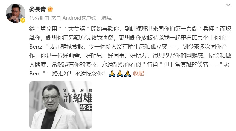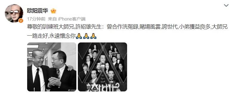 与许绍雄曾合作《洗冤录》《赌场风云》等多部剧的演员欧阳震华发布两人合照,称其为“尊敬的训练班大师兄”,表示:“小弟获益良多,大师兄一路走好,永远怀念你。”