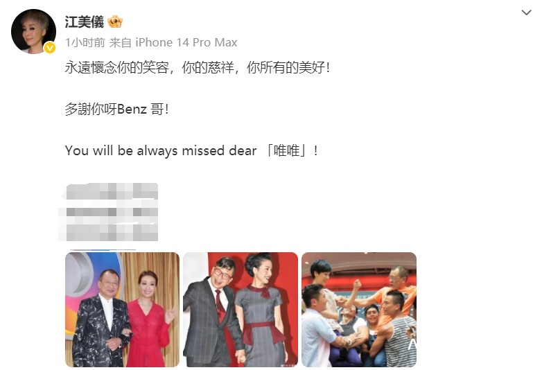 江美仪发文悼念称:“永远怀念你的笑容,你的慈祥,你所有的美好!多谢你呀Benz哥!”