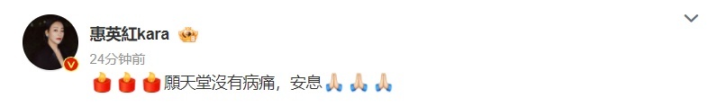 演员惠英红也发文悼念:“愿天堂没有病痛,安息。”