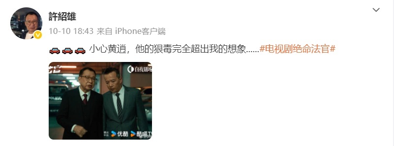 其微博最后一条发文停留在本月10月,内容是宣传新剧《绝命法官》。