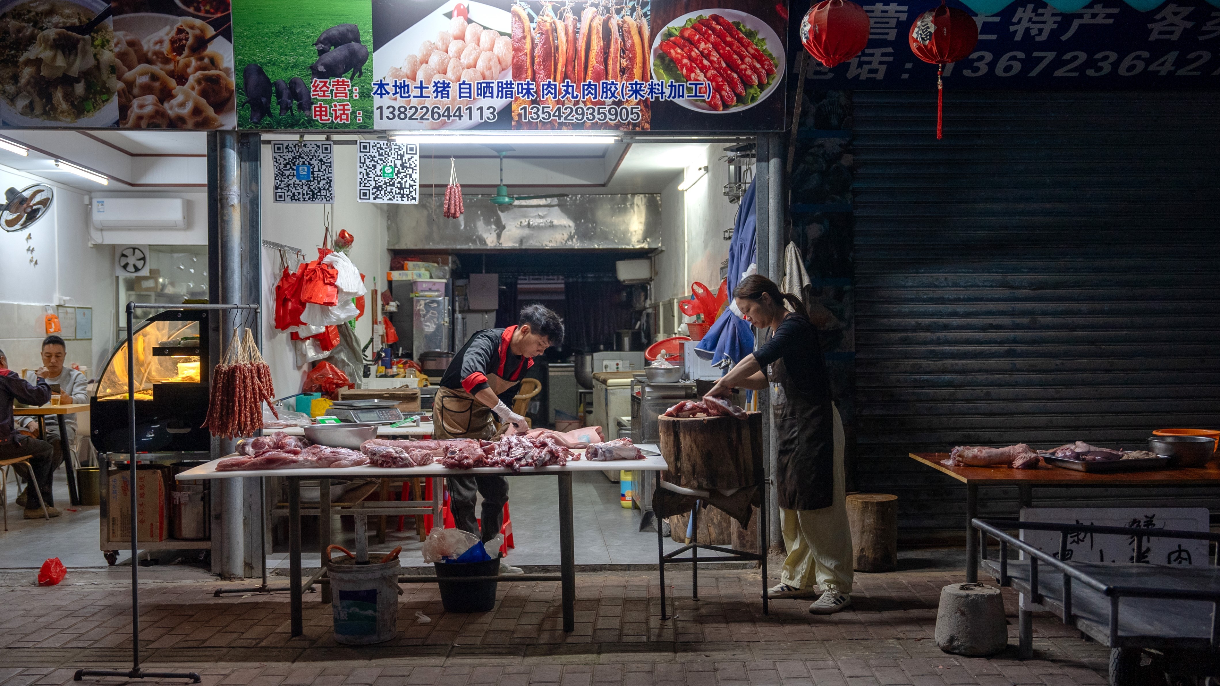 每天凌晨四点半,当广宁街道还裹着墨色,谢国宝已经起身。五点半,他准时将新鲜猪肉拉回档口,系上围裙,和妻子一起快速拆件,处理内脏装盘,码放整齐。日常半头猪15分钟就拆解完毕,接着处理猪头、猪脚、大肠,一切有条不紊。