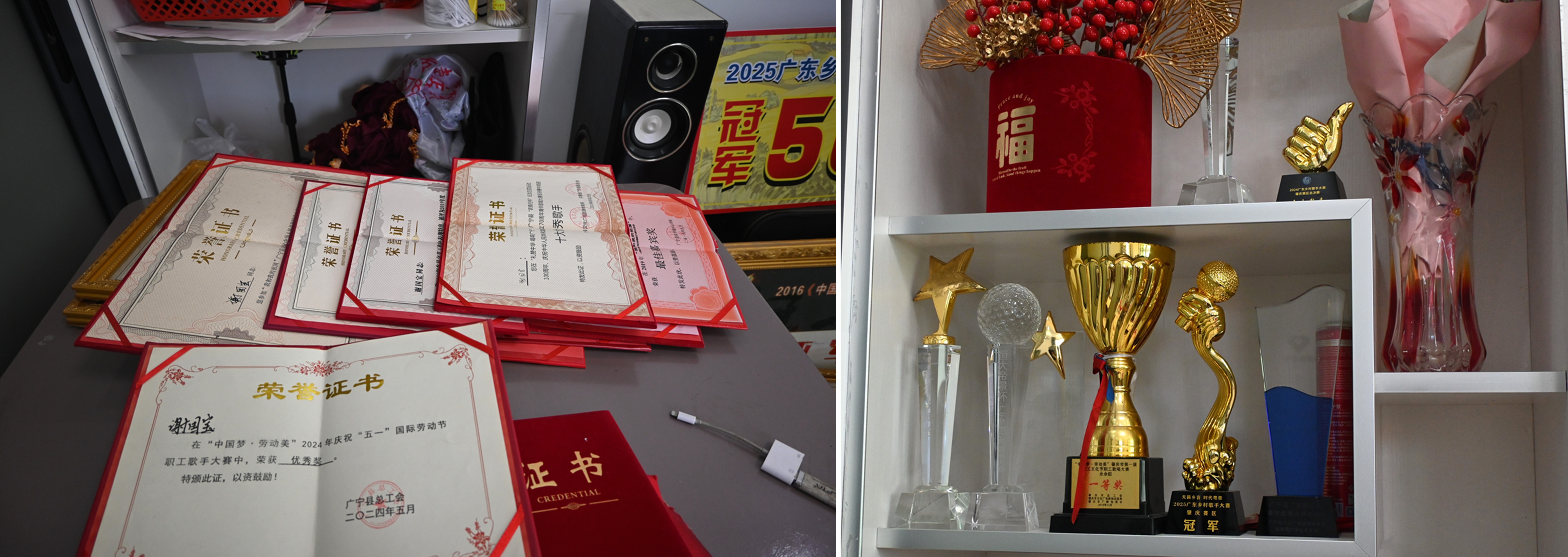 谢国宝的音乐之路,始终有亲情与友情的温暖笼罩。妻子谢秀珍是他的一号“粉丝”,也是最坚实的后盾。结婚19年,夫妻俩一起守着档口,为生活打拼。谢秀珍知道丈夫离不开唱歌,便主动多承担档口的活儿,让他有更多时间练歌。每次谢国宝参加比赛,她都会提前帮忙挑选搭配歌曲的服装,还会赶到现场,在台下为他记录影像,加油助威。
