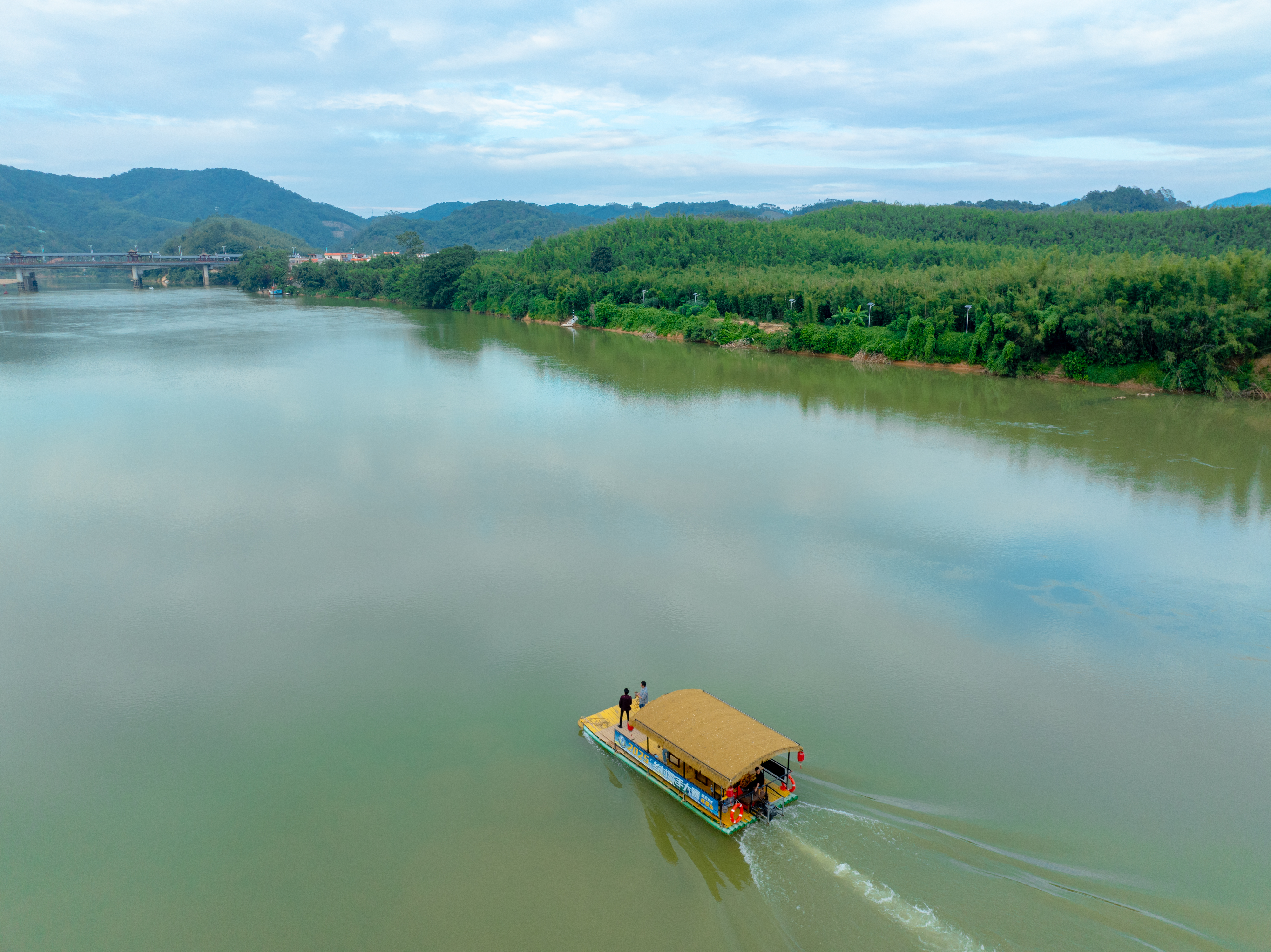 谢国宝和陈英华相约乘竹排漫游绥江,抒怀放歌。