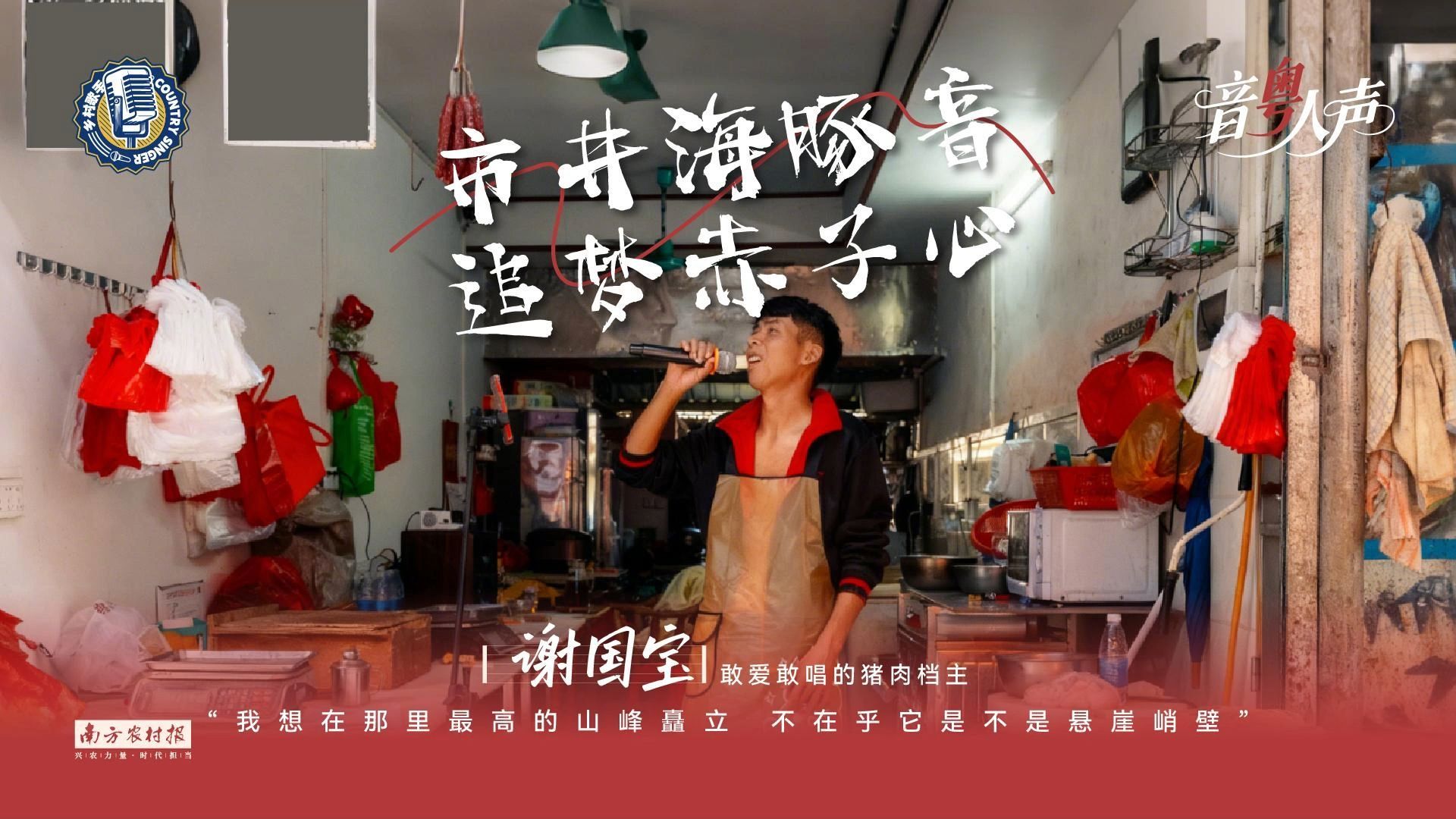 乡亲熟知的谢国宝,既有烟火市井的大众形象,也有独属于舞台的闪光一面。自从2016年《中国好声音》全国城市海选广宁赛区无意间获得了亚军,谢国宝就此发掘了潜力,在市县多项歌唱大赛中崭露头角,并逐渐获得了商演机会。