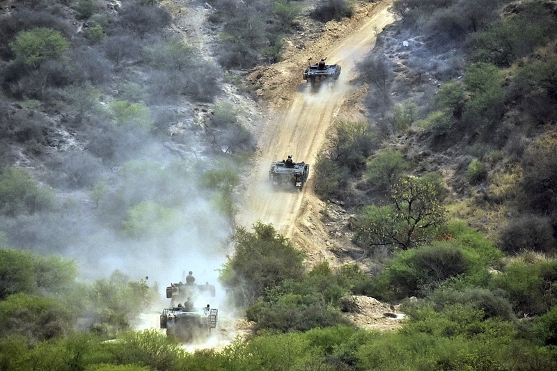 △5月1日,巴基斯坦军方在射击场进行军事演习,坦克穿行于演习场地。