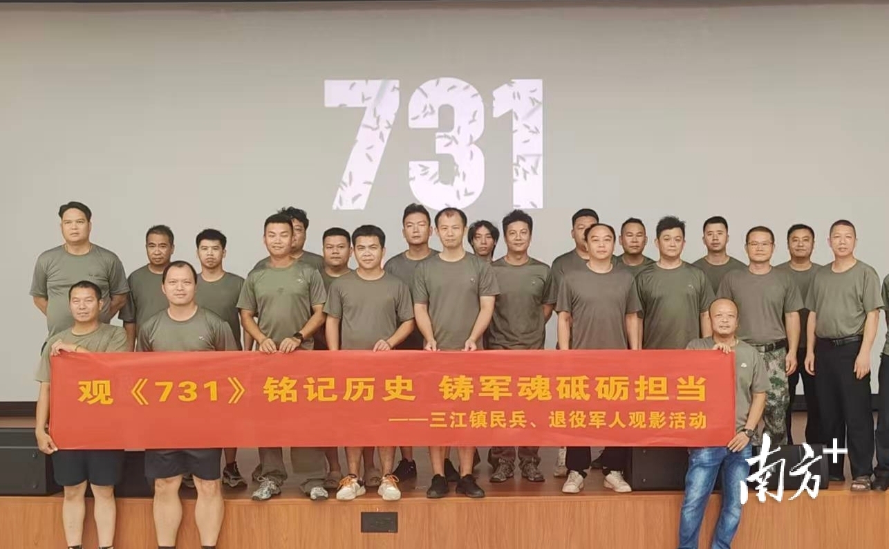 组织民兵以及退役军人观看抗战题材电影《731》。连南人武部供图