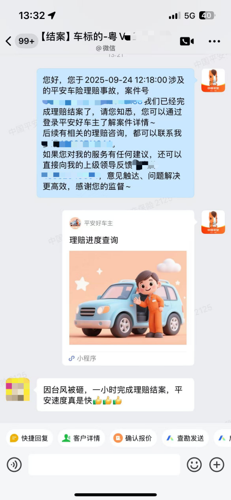 9月24日12时,许先生车辆被倒塌墙体砸损,报案后理赔员远程指引取证,仅1小时便完成全部流程,2500元赔款顺利到账,许先生对“报案即响应、定损快处理、结案高效率”的服务高度认可。此外,平安产险东莞分公司开通大灾理赔绿色通道,确保台风相关案件优先处理、快速到账,让客户切实感受“省心、省时又省钱”。