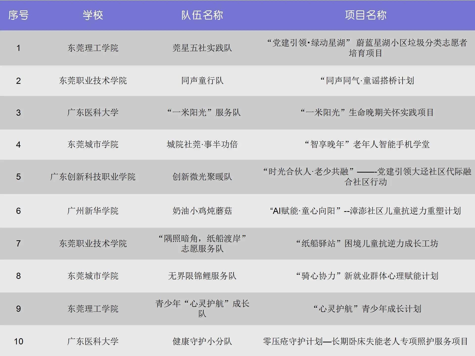 经严格评审,最终确定10支队伍的项目晋级。这些队伍将获得广东省与人公益基金会提供的项目执行资金支持,并深入东莞市多个社区开展党建治理创新、民生保障及社会发展等多类服务实践,促进理论知识与实务技能的深度融合。晋级的队伍还将在后续的决赛环节中继续展现其专业素养和创新实力。