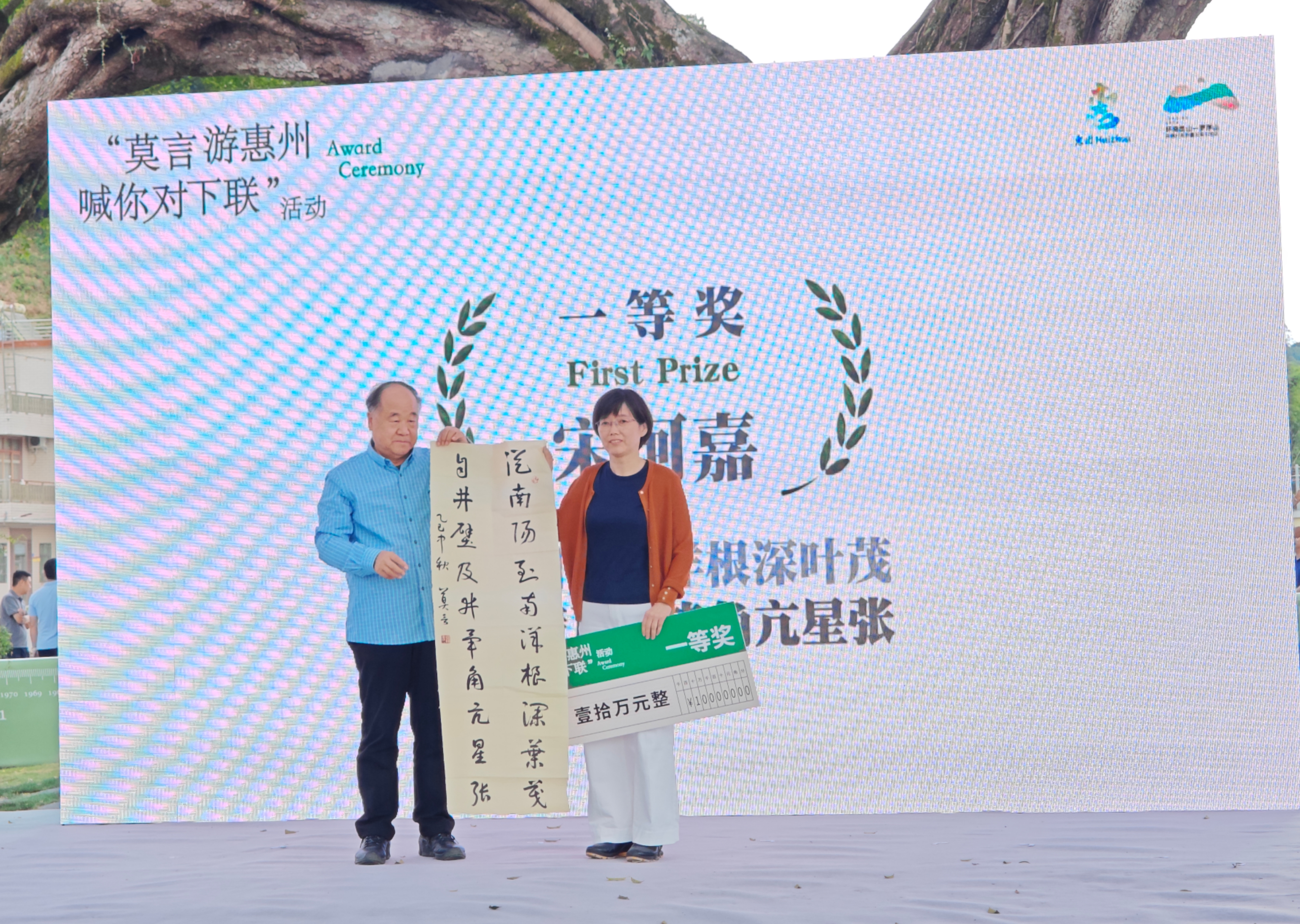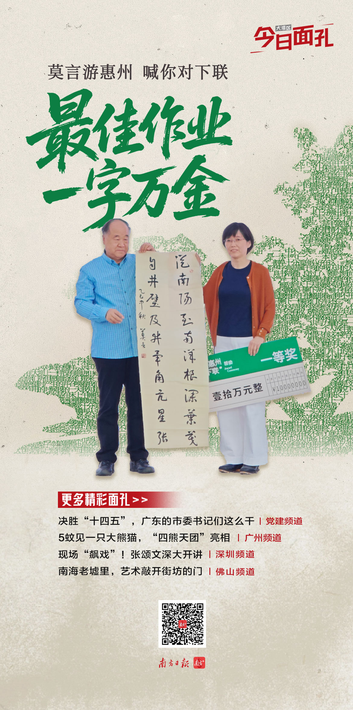 10月20日,“莫言游惠州,喊你对下联”活动收官,经过专家学者层层筛选,活动评选出一、二、三等奖共六个优秀作品。其中一等奖作品获颁10万元奖金,堪称“一字万金”。征联掀热潮>>