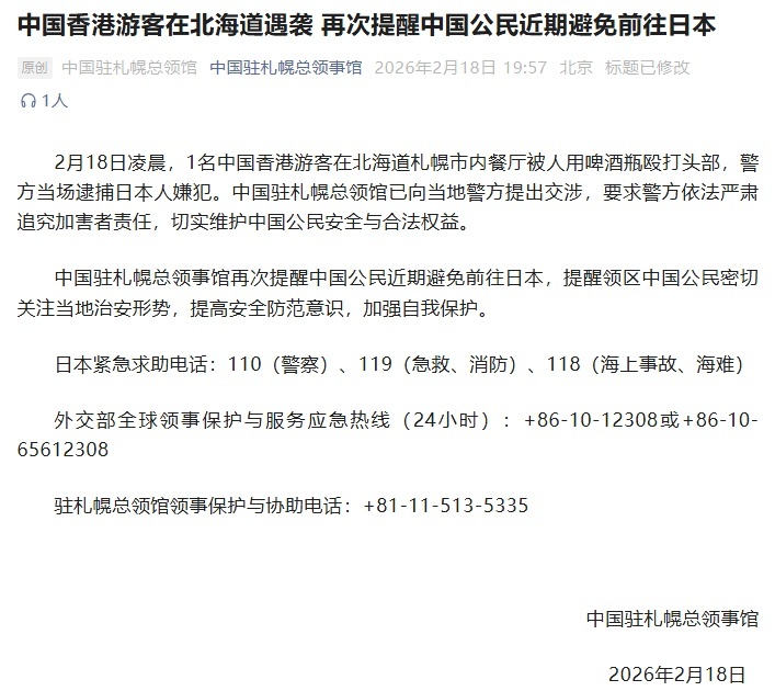 2月18日凌晨,1名中国香港居民在北海道札幌市内餐厅被人用啤酒瓶殴打头部,警方当场逮捕日本人嫌犯。中国驻札幌总领馆已向当地警方提出交涉,要求依法严肃追究加害者责任,切实维护中国公民安全与合法权益。