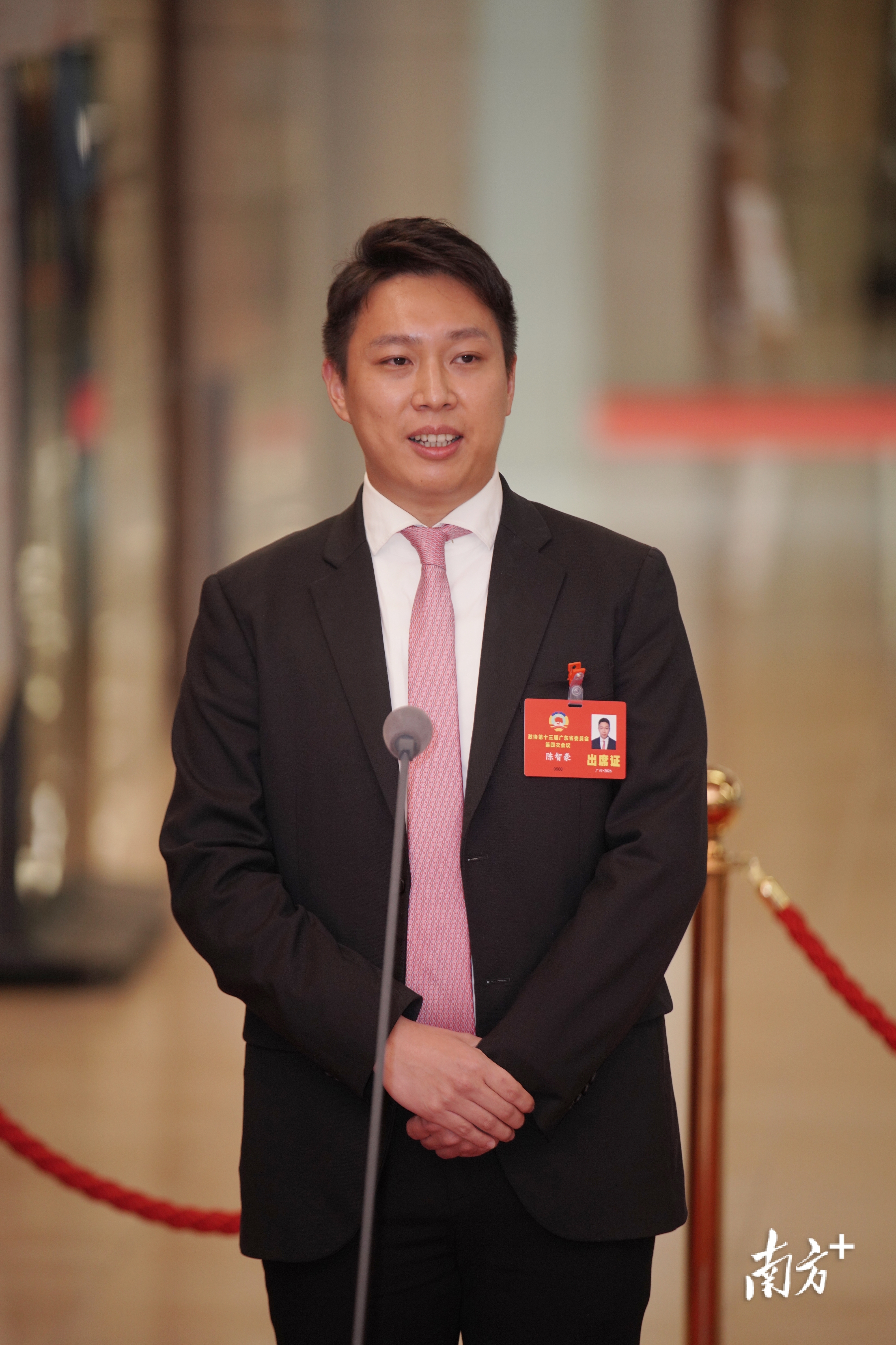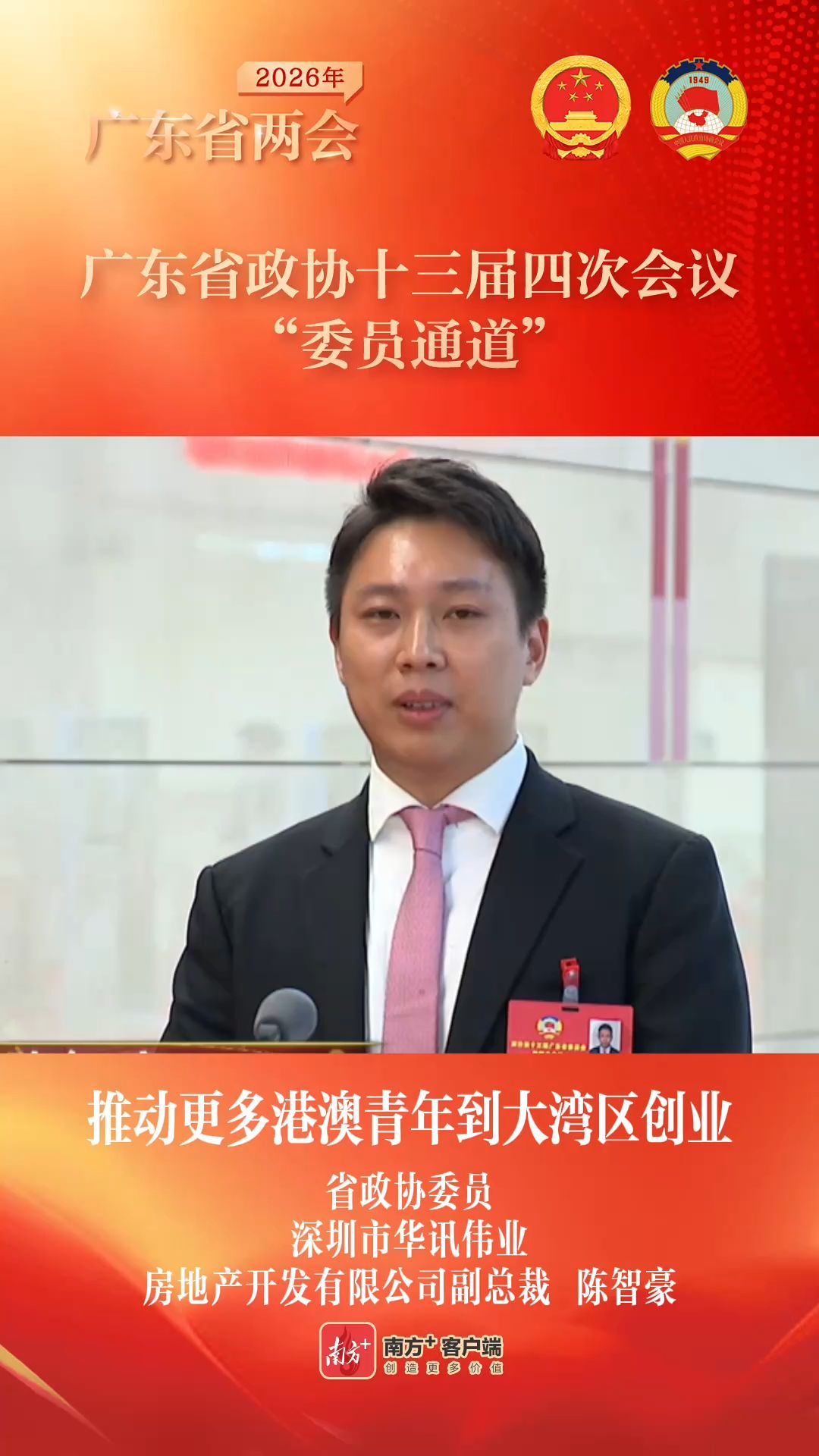 1月28日上午,在广东省政协十三届四次会议第二场“委员通道”上,省政协委员、深圳市华讯伟业房地产开发有限公司副总裁陈智豪分享如何将港澳青年喜欢的“北上”“消费热”转变为“创业潮”。