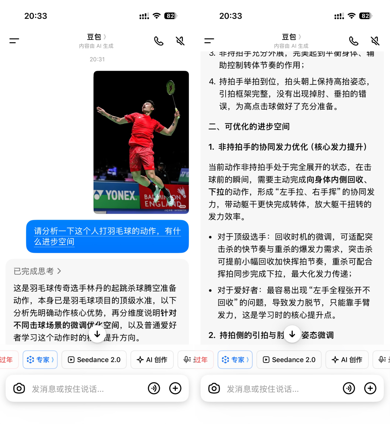 南都N视频记者使用豆包专家模式,发送了一张林丹打球图,让豆包分析这个动作,并提出改进空间。豆包直接提出这是羽毛球传奇选手林丹的起跳杀球腾空准备动作,并分析了这个动作的核心优势和可优化进步空间。