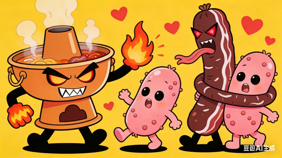 高脂红肉在高温下反复涮煮,会产生杂环胺、多环芳烃等致癌物,这些物质会直接损伤肠道黏膜DNA