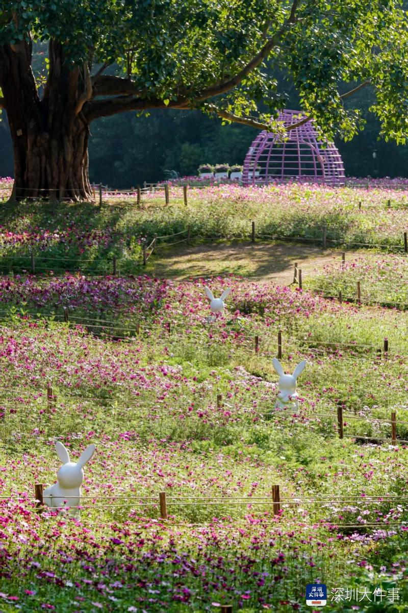 在菩提树草坪,近3000平方米的波斯菊正开得奔放。阿波罗、奏鸣曲等十余个品种,用粉、白、紫等色彩交织出一片宛如自然调色板的壮丽花海,是拍照打卡不可错过的背景板。