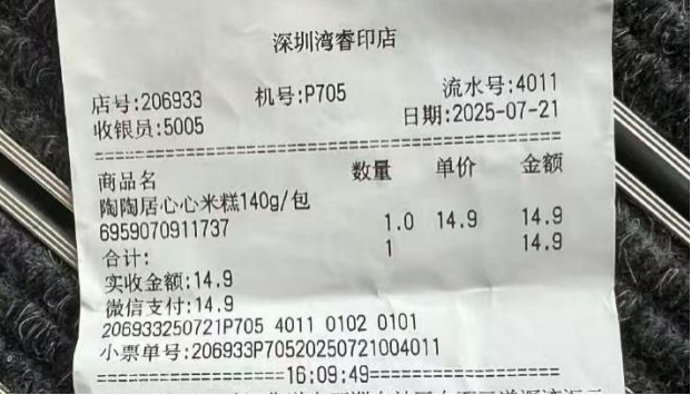 邓先生公布的图片显示,涉事超市是Olé精品超市深圳湾睿印店,地址位于南山区沙河街道白石洲东社区。邓先生购买的是一袋品牌为陶陶居的心心米糕,售价14.9元,生产日期为2024年7月12日,保质期为1年,到期时间为今年7月12日,而邓先生的购物时间为7月21日,按推算食品已过期9天。