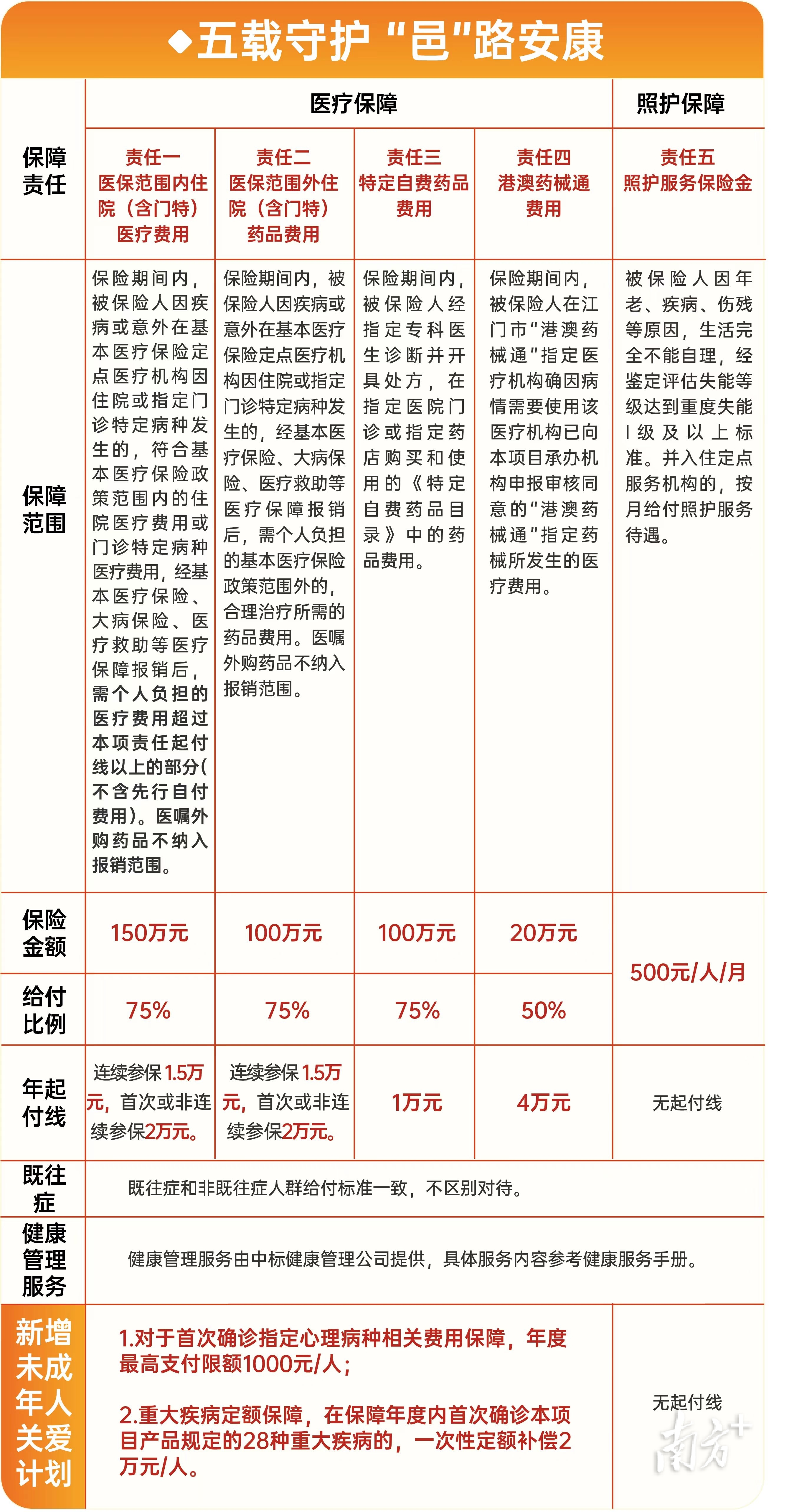 值得关注的是,2026年“邑康保”保费连续五年保持150元不变,待遇持续升级,2026年“邑康保”最高保障超370万元,涵盖医保范围内住院(含门特)医疗费用、医保范围外住院(含门特)药品费用、特定自费药品费用、港澳药械通费用、照护服务保险金以及未成年人关爱计划共六大保障责任。