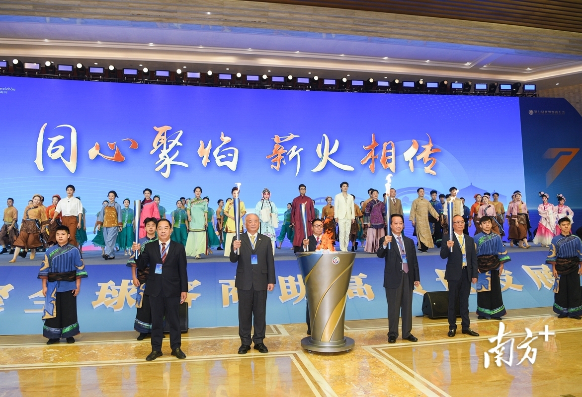 11月24日,第七届世界客商大会会场,5名客商代表手持火炬,共同点燃主火炬。