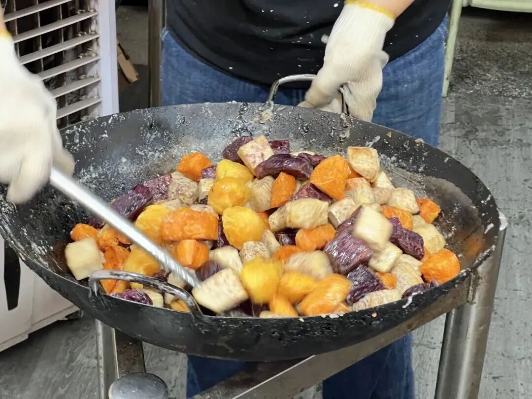 刚制作好的反沙番薯芋,还在热腾腾冒气,糖霜嵌于表面,颗粒分明,入口松化,内里甜糯,配上一杯免费的热茶,太绝了!