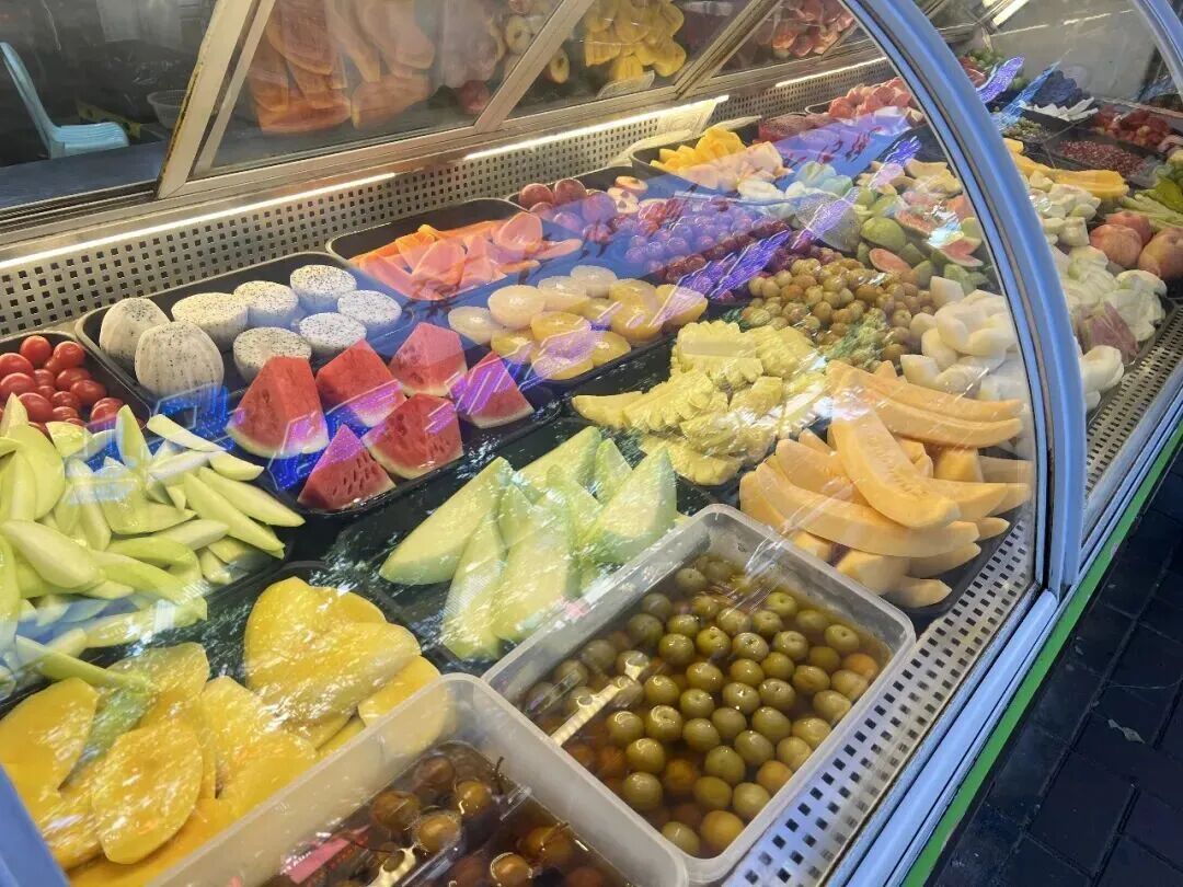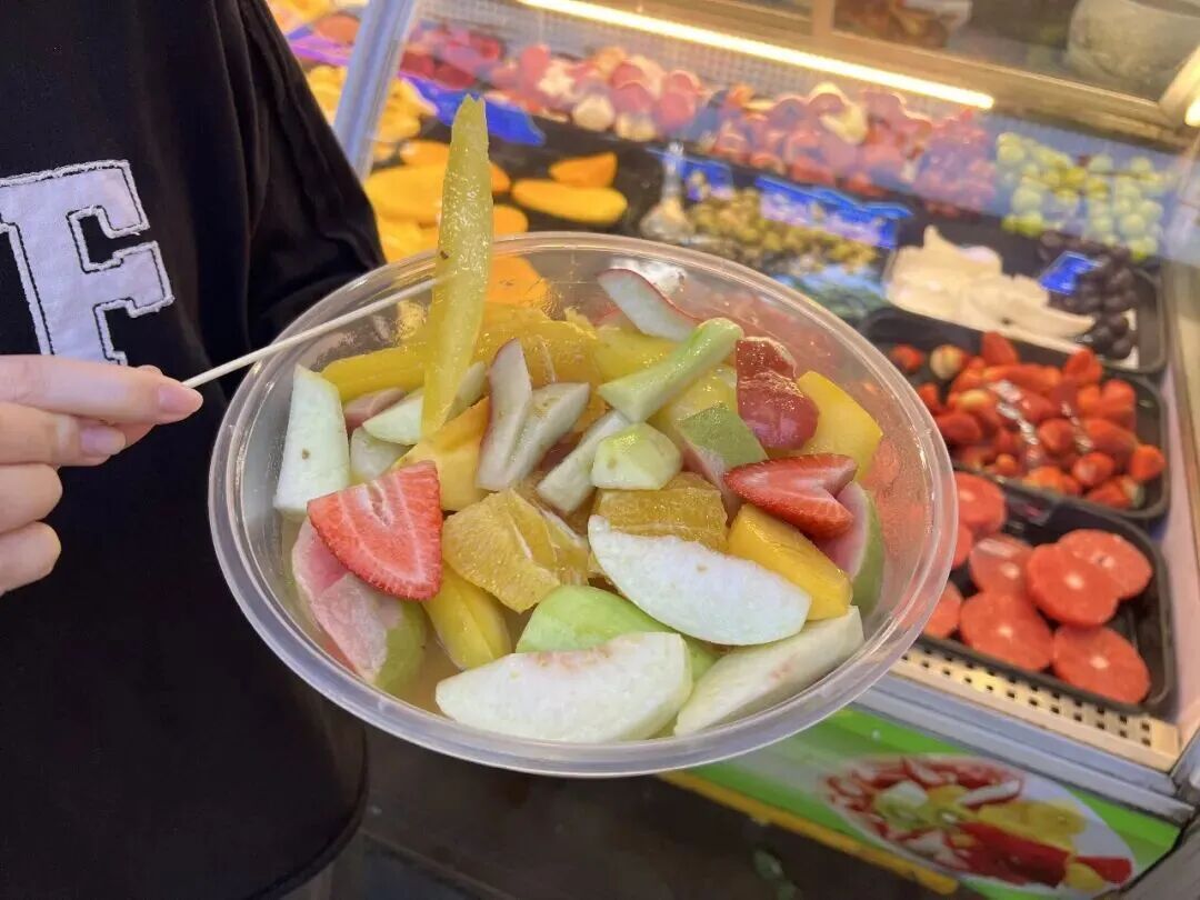 跟老板说需要哪种水果,要多少,称好切块后拌上糖、盐、甘草汁、南姜末等,平凡无奇的水果,瞬间变得楚楚动人。