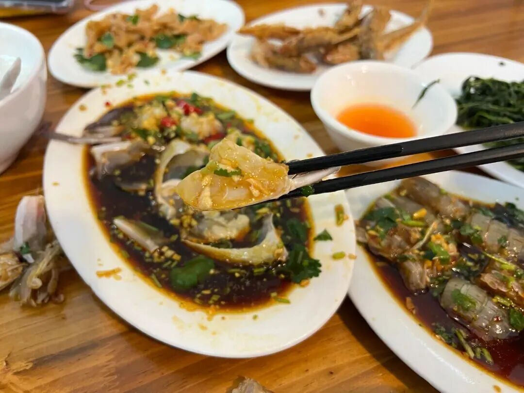 生腌新鲜入味,搭配炒茄子、麻叶、鸭肠、鱼饭等各种配菜,再加上一碗暖胃的白粥,这是什么神仙生活呀!