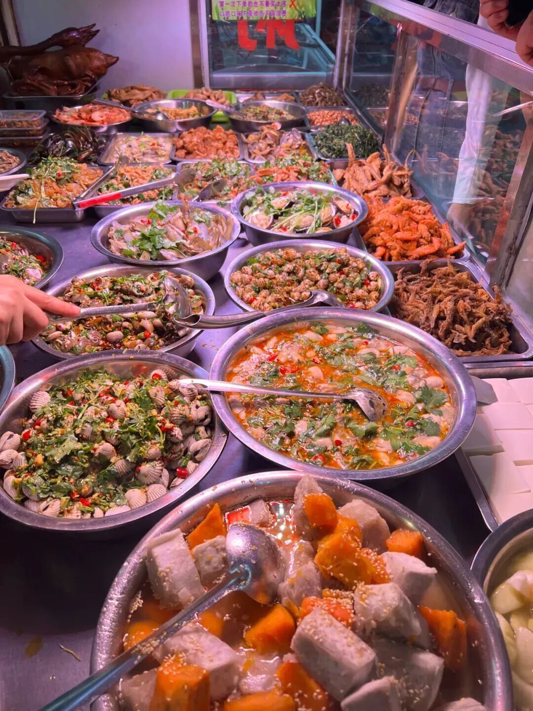 膏蟹、皮皮虾、活虾、生蚝、血蛤......都超级新鲜,还有各种鱼饭、炒菜、青菜,让人目不暇接。