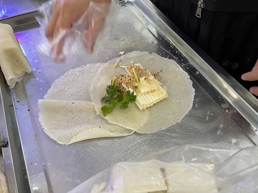 用薄饼把糖葱、芝麻花生、香菜包裹起来,一口咬下,口感香脆有层次,各种料融合得也很好,满口留香。