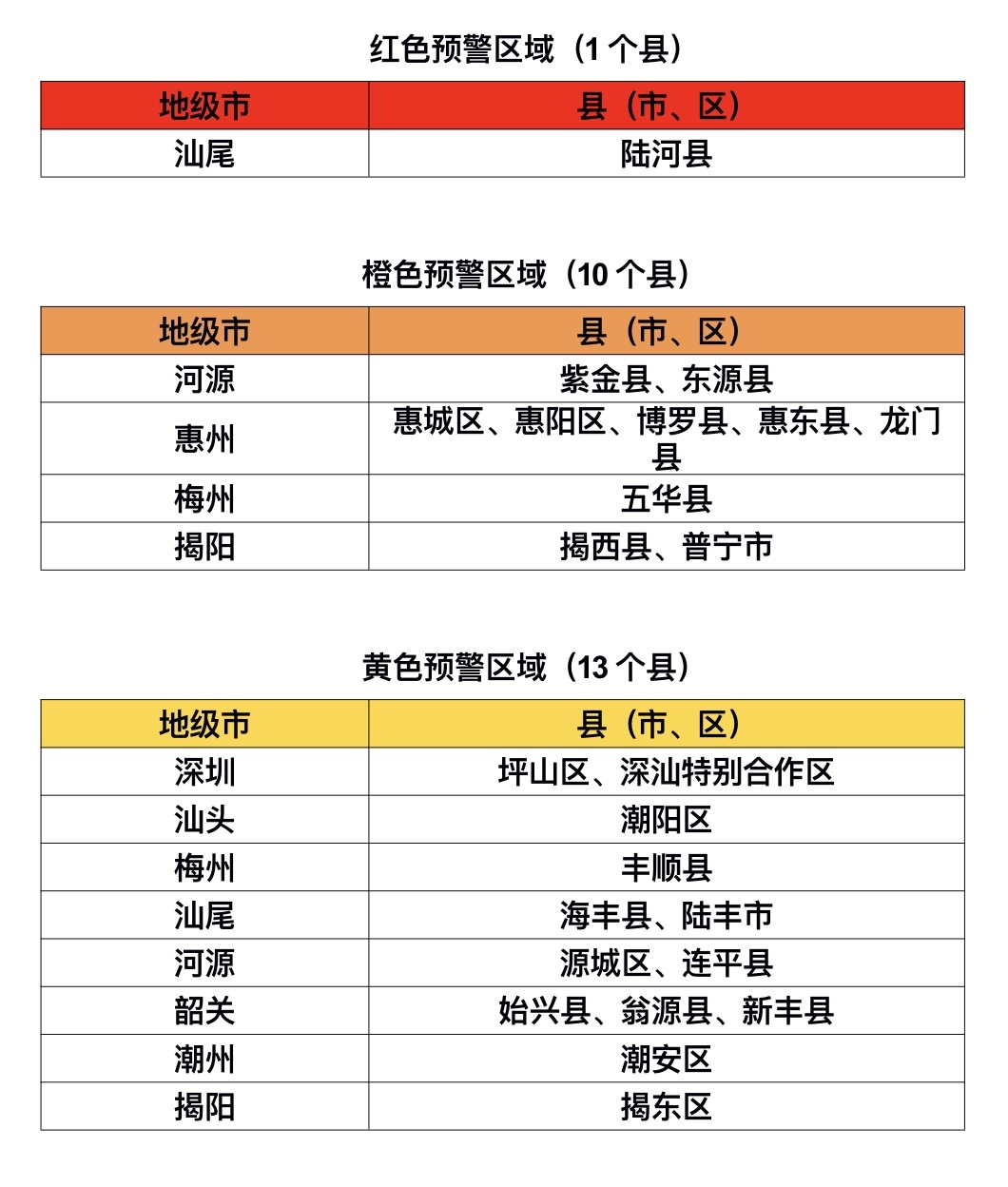 深圳坪山区、深汕特别合作区,汕头潮阳区,梅州丰顺县,汕尾海丰县、陆丰市,河源源城区、连平县,韶关始兴县、翁源县、新丰县,潮州潮安区,揭阳揭东区,局地发生山洪灾害可能性较大(黄色预警)。