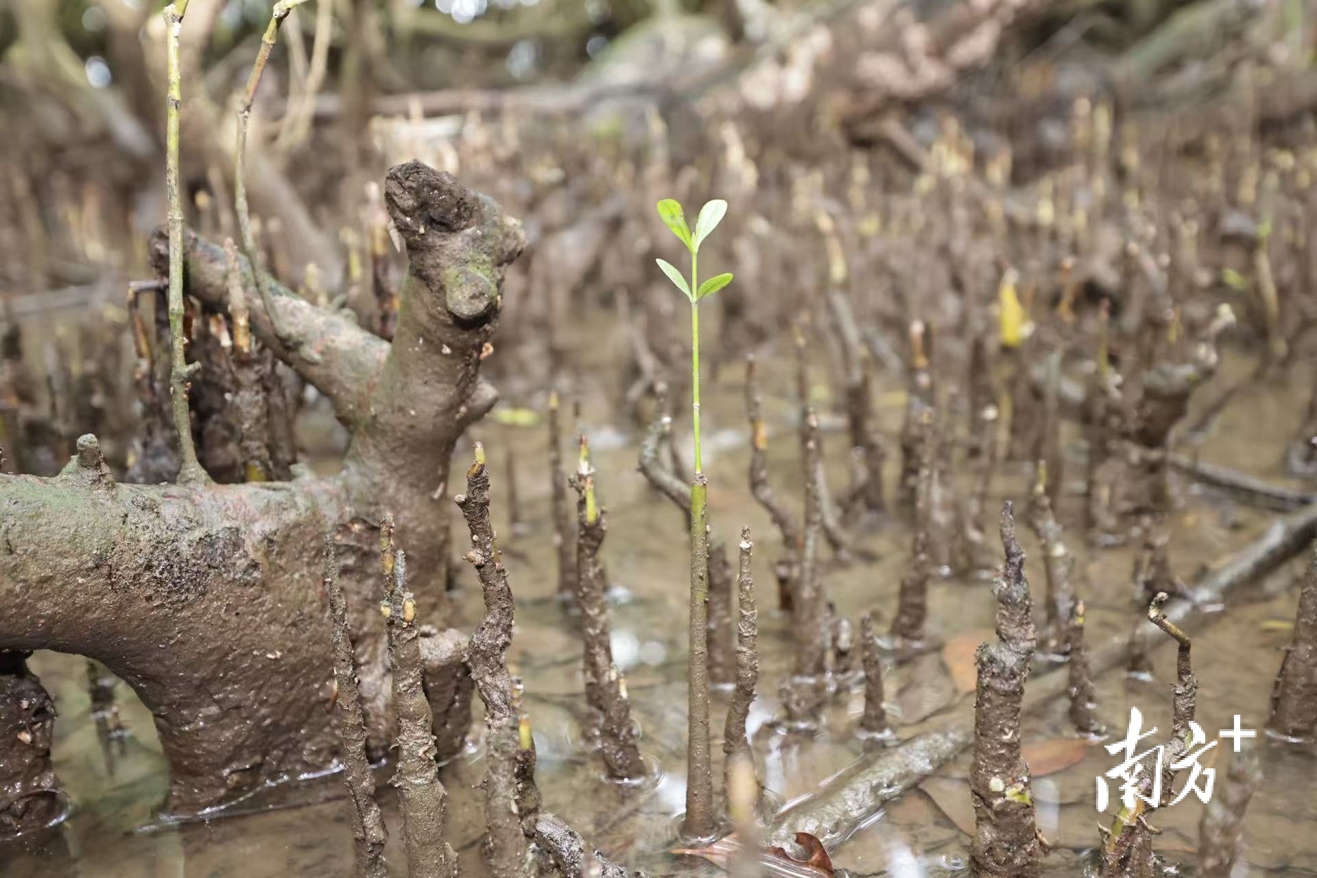 9月9日,汕头市澄海区培隆沙滩一带红树林,红树林下海漂垃圾已清理完毕,一棵红树林苗长出新芽。